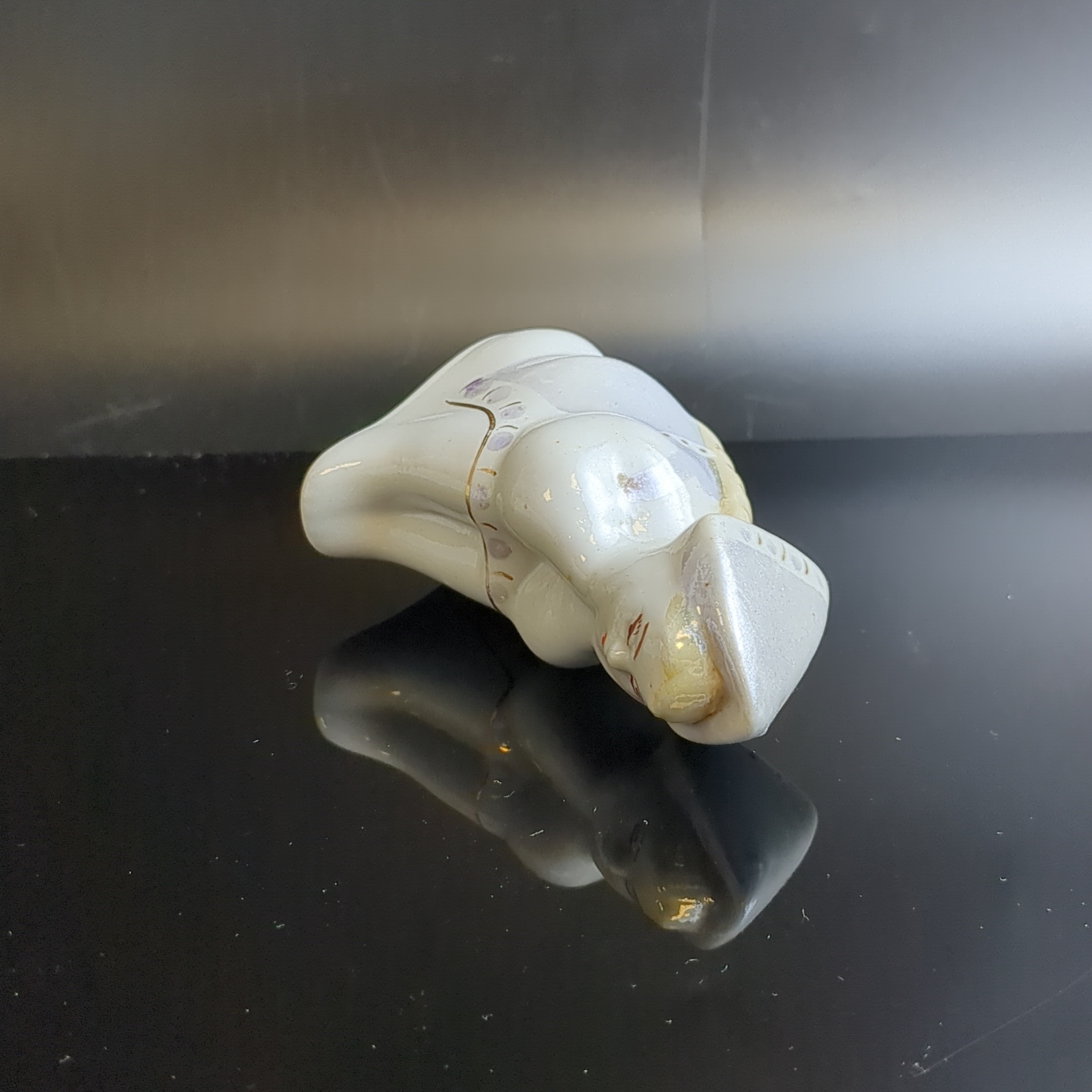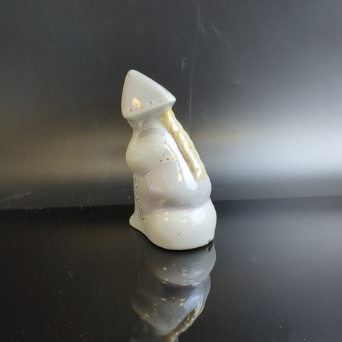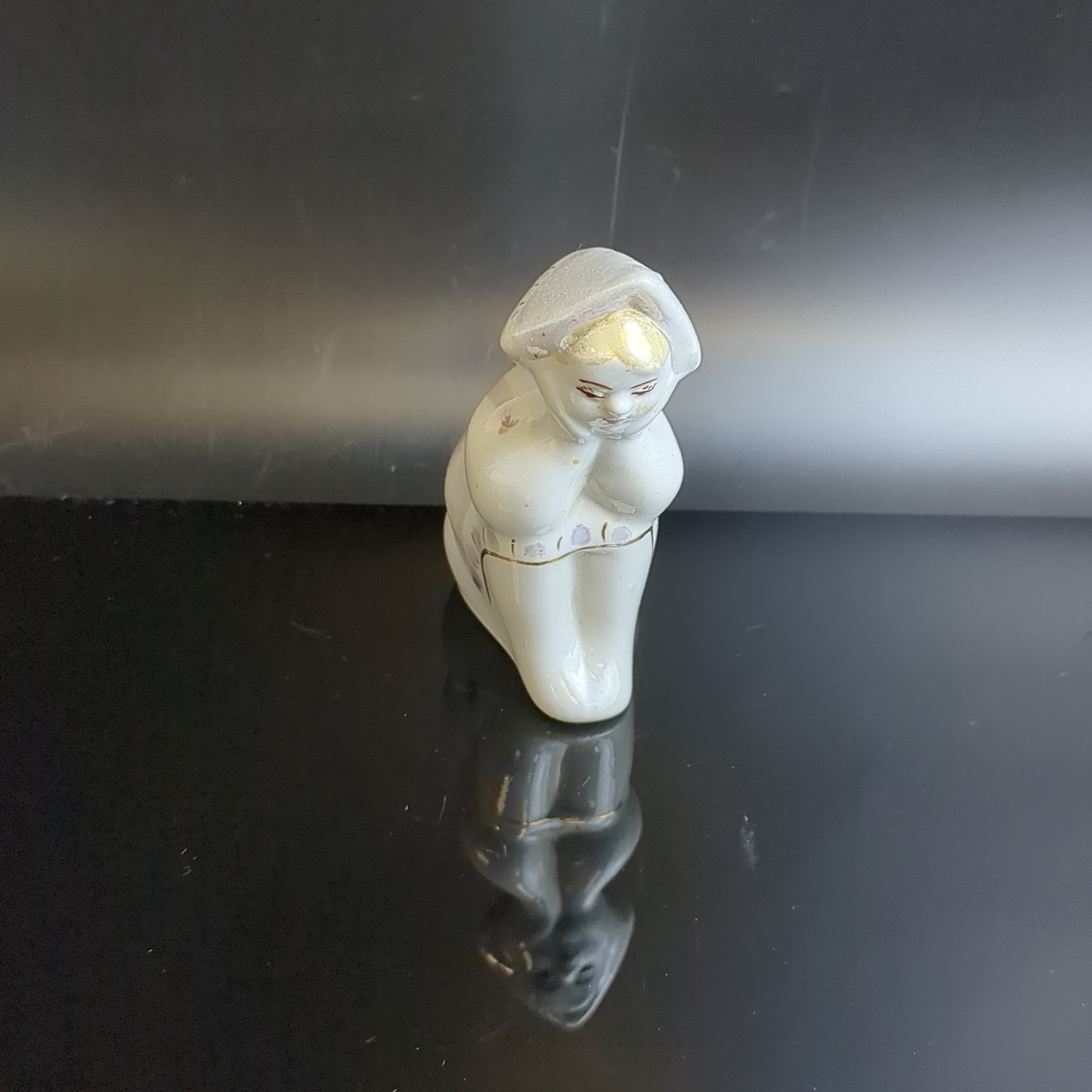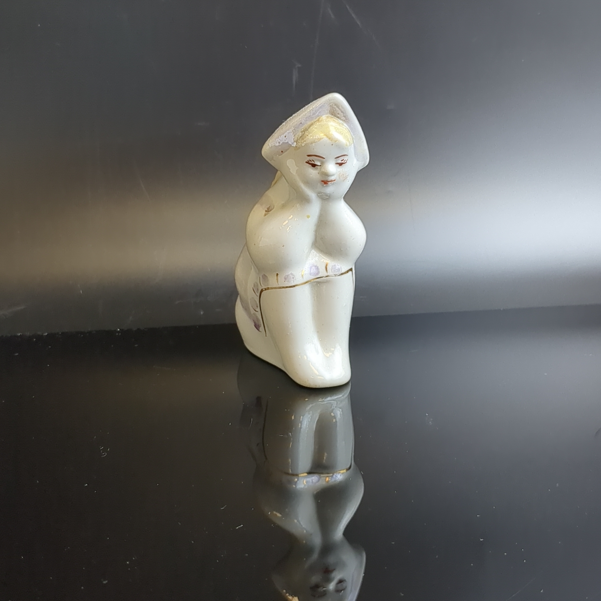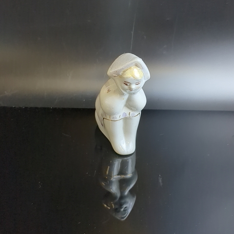 Фарфоровая статуэтка Алёнушка, девочка в платочке / Аленка. Фарфор, роспись, золочение, Сысертский завод керамических изделий, СССР, 1960-1980 гг. Скольчик снизу. Автор С.И. Синявская. Высота 8,8 см. Каталожная статуэтка редкая