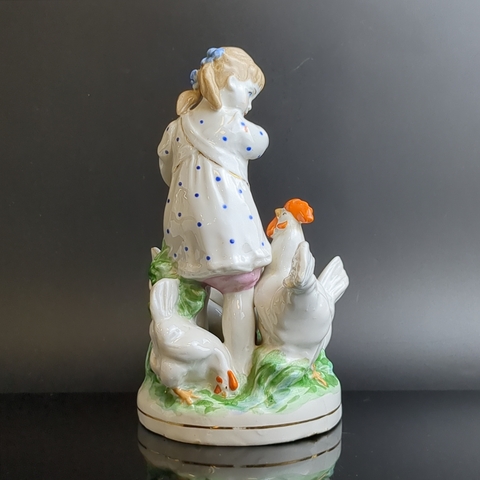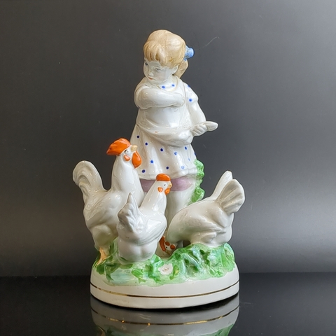 Статуэтка Девочка кормит кур, фарфор, роспись, золочение, Дулевский фарфоровый завод Дулёво, скульптор Н. Малышева, СССР, 1956 г.