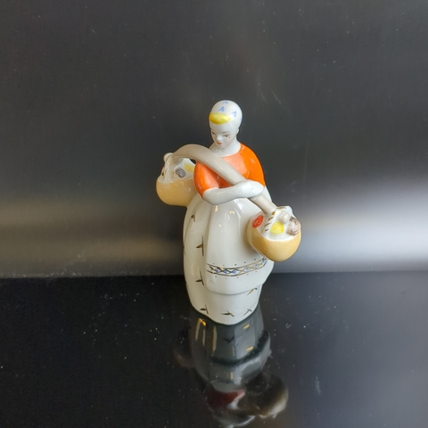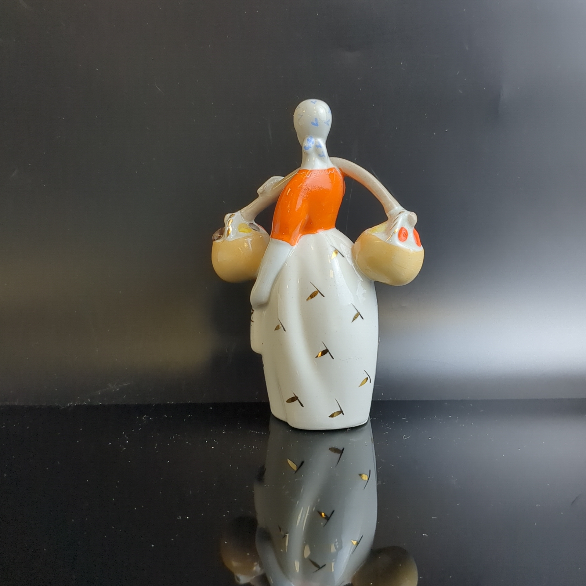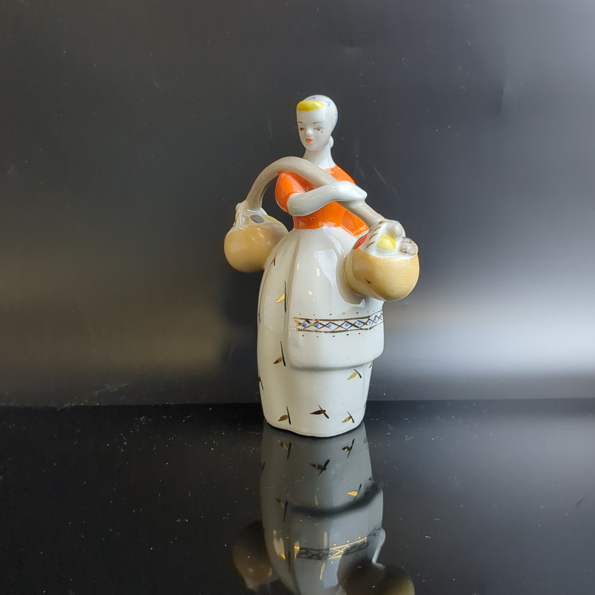 Статуэтка "Девушка с коромыслом" ("Девушка с грибами"), автор Н. Ф. Бобик и Т. Н. Шуляк, фарфор, роспись, золочение, Полонский завод художественной керамики (Полонное ЗХК), СССР, 1973-1990 гг.