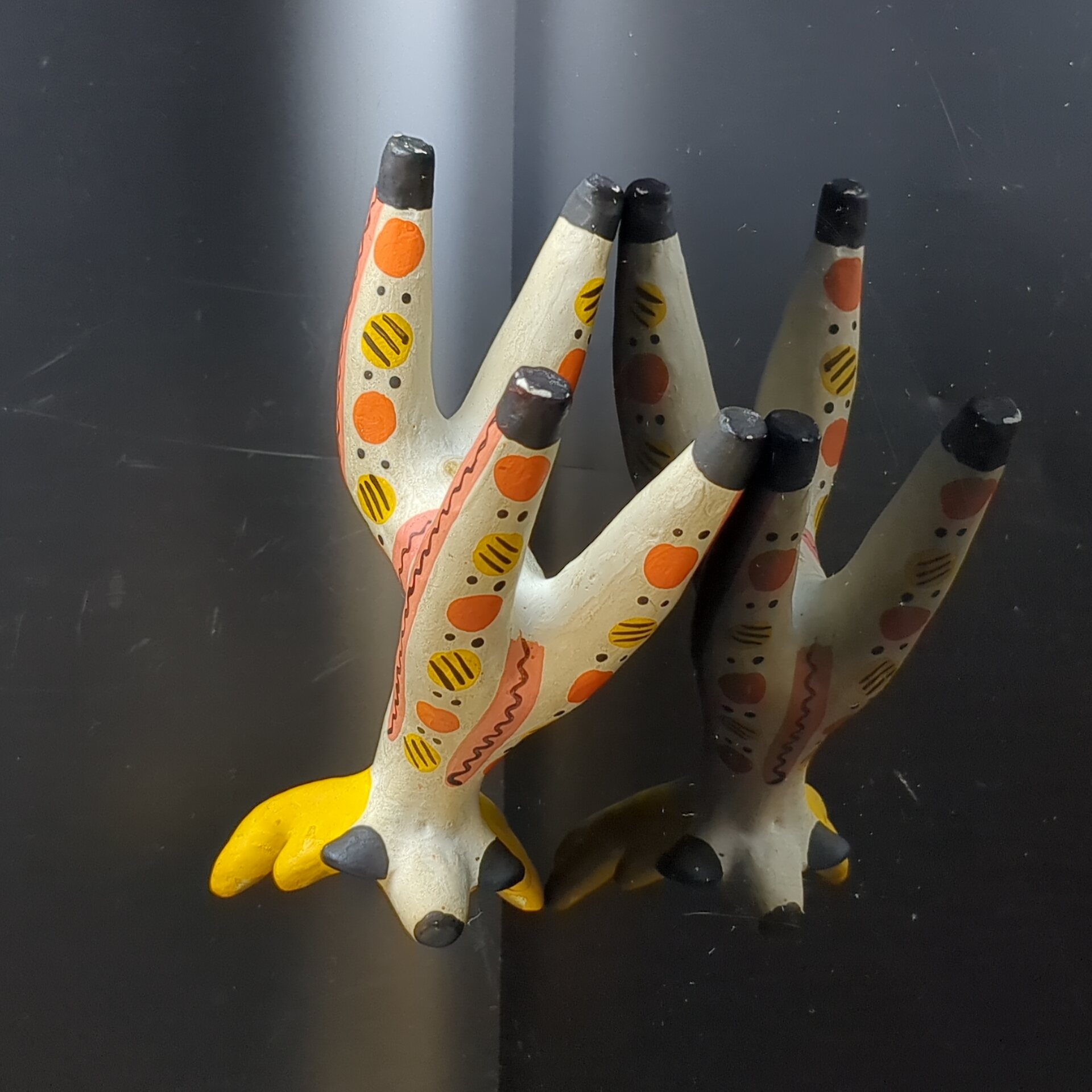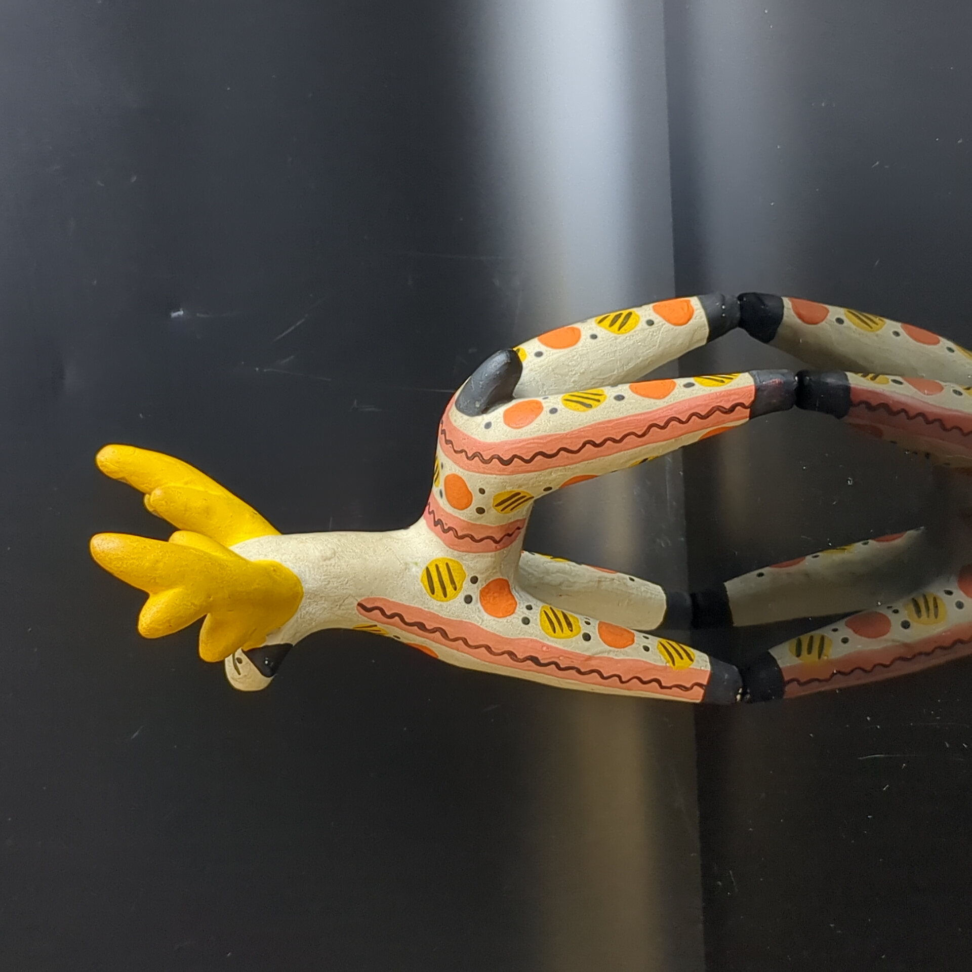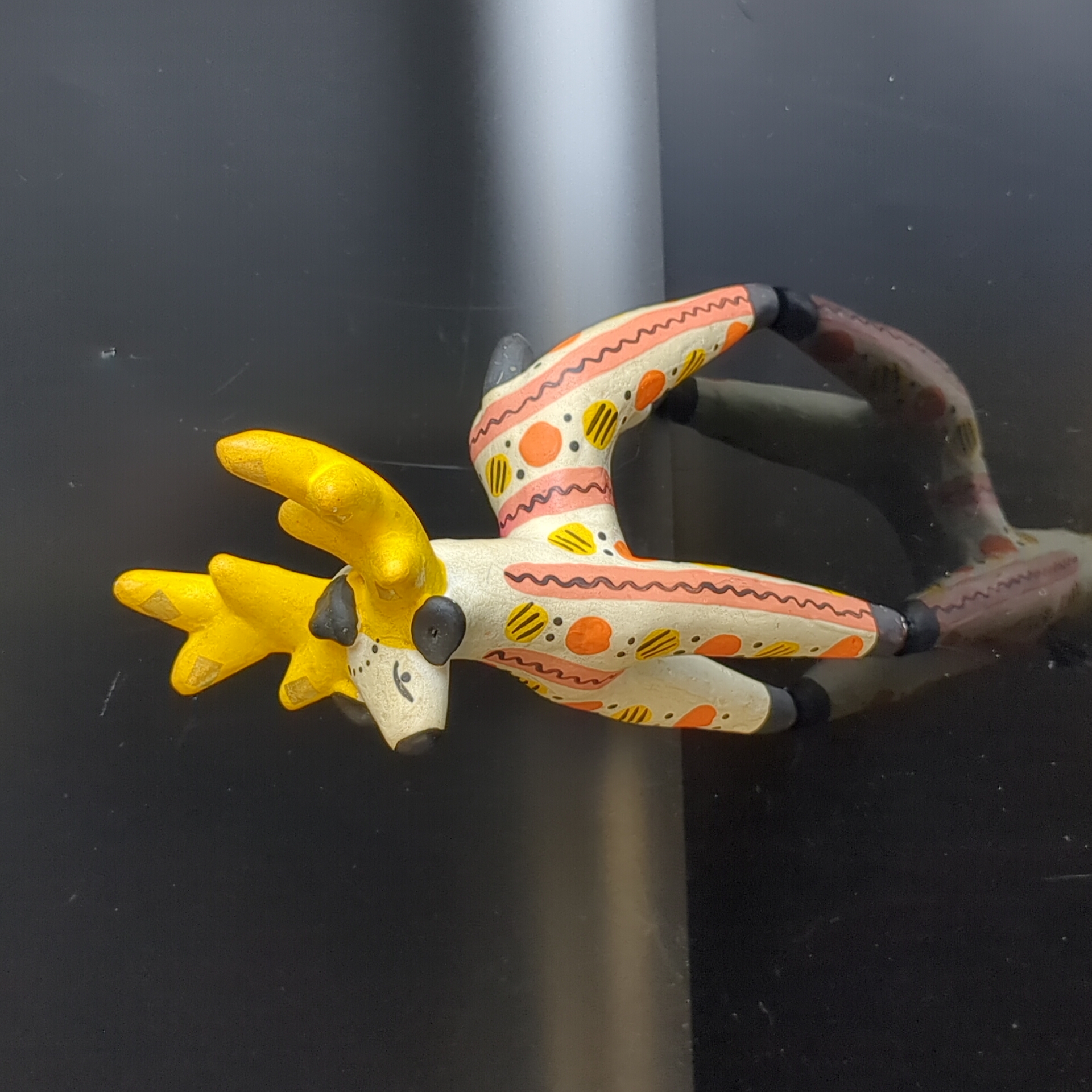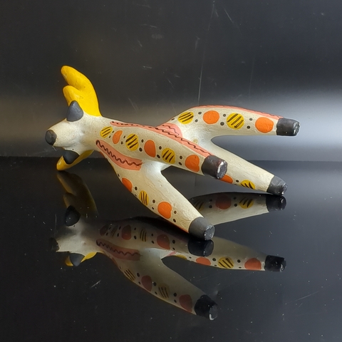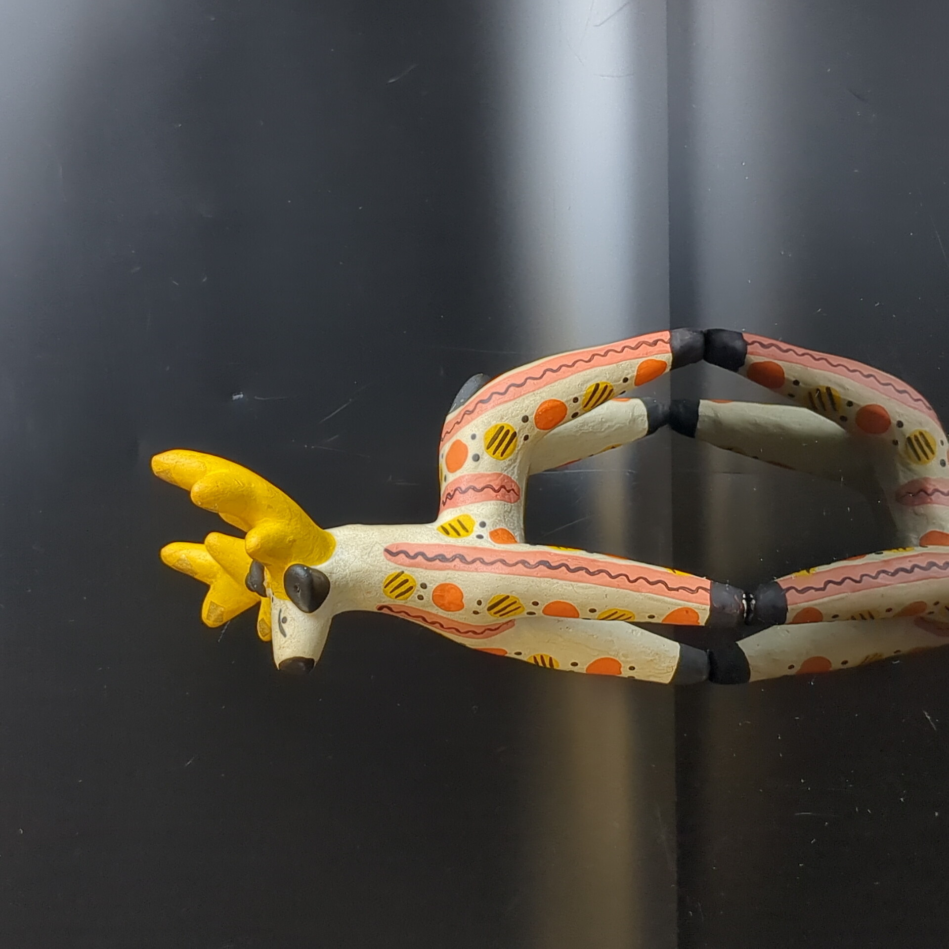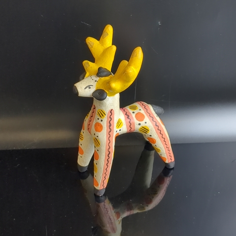 Статуэтка Дымковская игрушка Олень с золотыми рогами, 15,5 см, Киров/Вятка/Хлынов, глина, ручная лепка и роспись, СССР 1970-1990 гг. Дымковская игрушка – один из самых известных промыслов русской народной игрушки. Он возник в слободе Дымково Вятской губернии. Дымковскую игрушку лепят из красной глины, смешанной с просеянным речным песком. Дымковская игрушка олень символизирует богатство, плодородие, силу природы и является оберегом, а «золотые рога» подчеркивают его сказочность и волшебство, отражая древние традиции с оберегами и символикой (солнце, ромбы), поэтому олени часто фигурируют в росписи в сочетании с яркими цветами и геометрическими узорами для привлечения благополучия. Сервантное хранение, присутствуют следы использования - состояние на фото