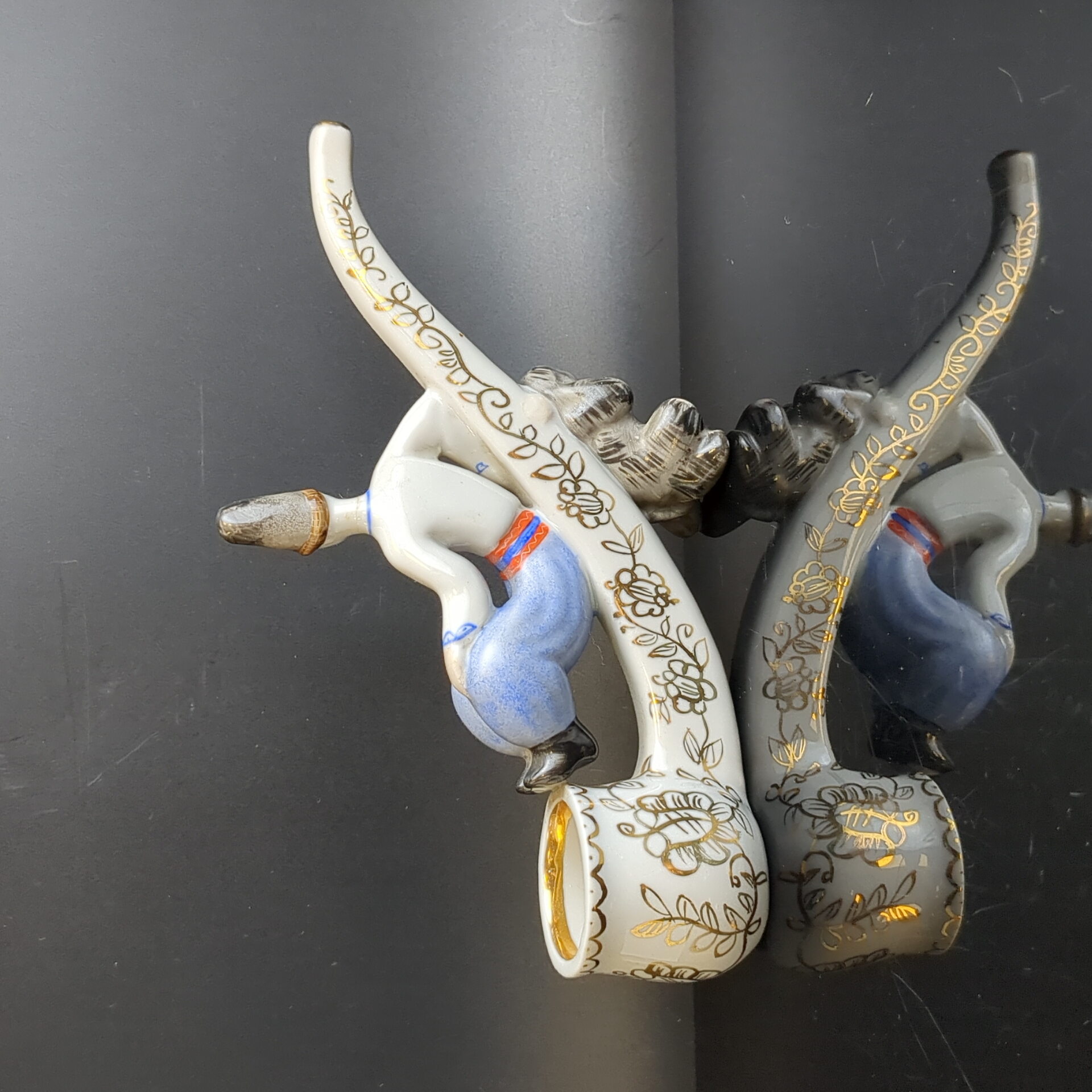 Статуэтка (трубка) "Вакула с чертом", авторы В.И. Щербина и К.М. Никитаева, фарфор, роспись, золочение, Киевский экспериментальный керамико-художественный завод (КЭКХЗ), СССР, 1976-1991 гг