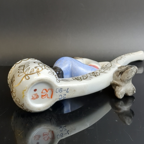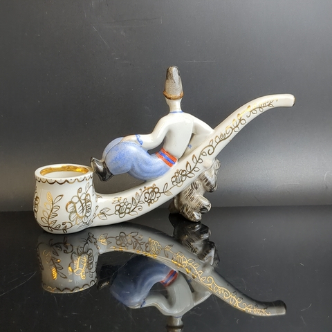 Фарфоровая статуэтка (трубка) Вакула с чертом / казак на трубке, авторы В.И. Щербина и К.М. Никитаева. фарфор, роспись, золочение, Киевский экспериментальный керамико-художественный завод (КЭКХЗ), СССР, 1976-1991 гг.. Размеры 19,5 х 11 см. Есть незаметный дефект - Шея склеена. Состояние на фото