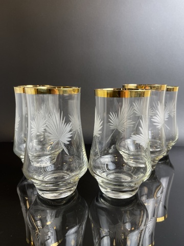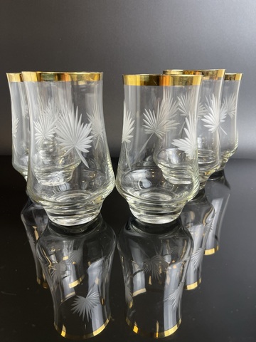 Стеклянные стаканы набор из 6 штук, винтажные, резной декор, позолота, высота-12 см, СССР 1970-1990 гг. Изящные бокалы для разных напитков времен СССР. Присутствуют незначительные следы использования - царапинки маленькие на позолоте- состояние на фото
