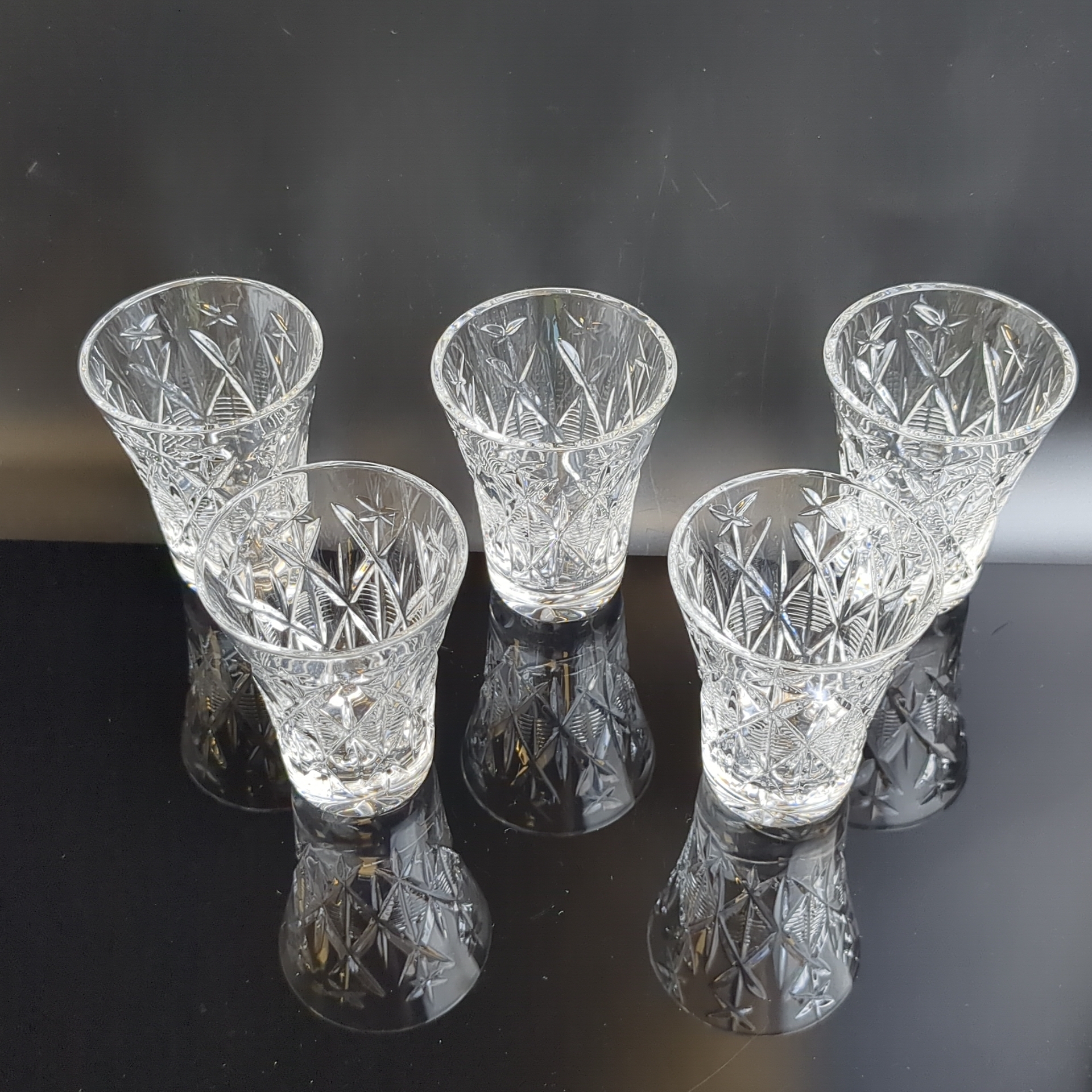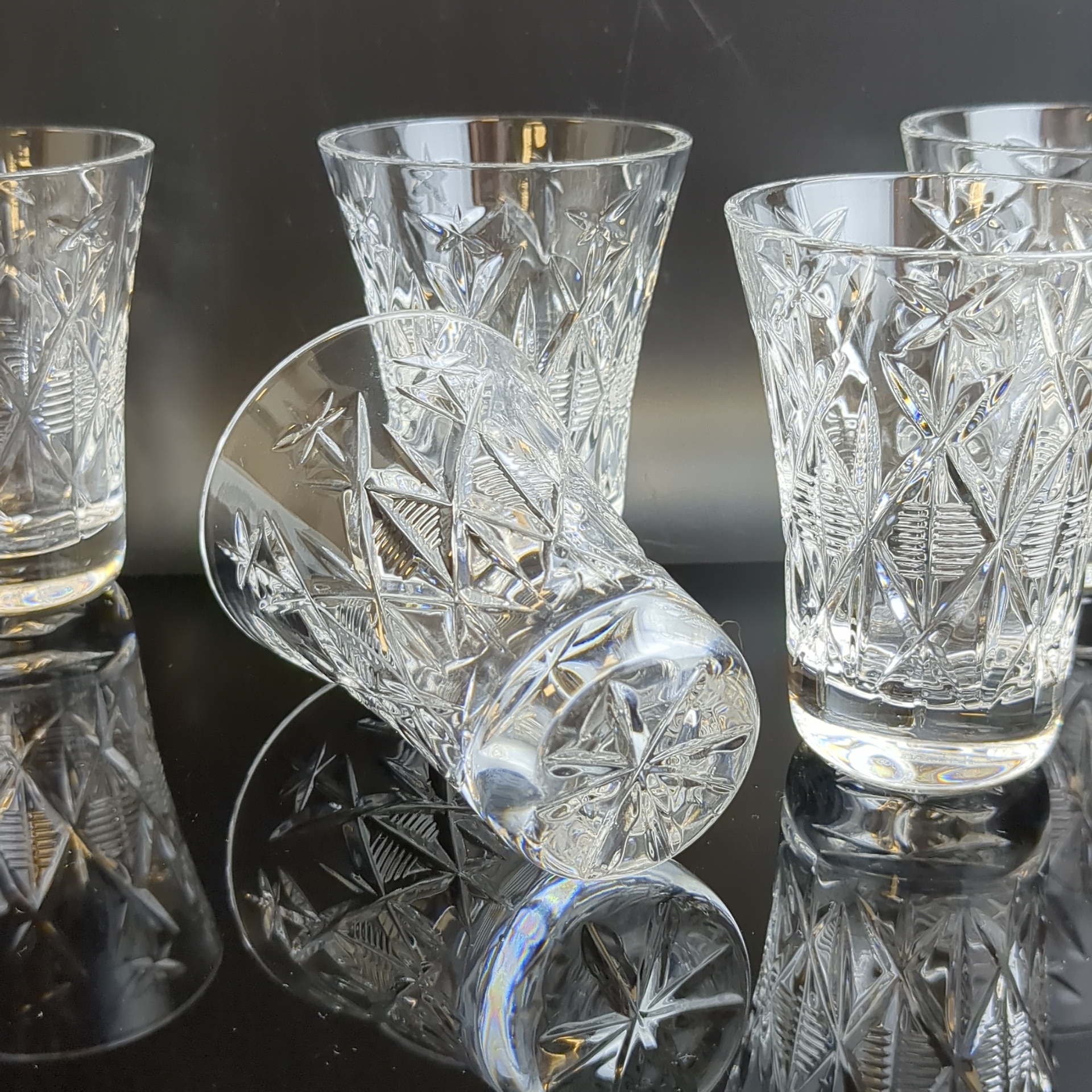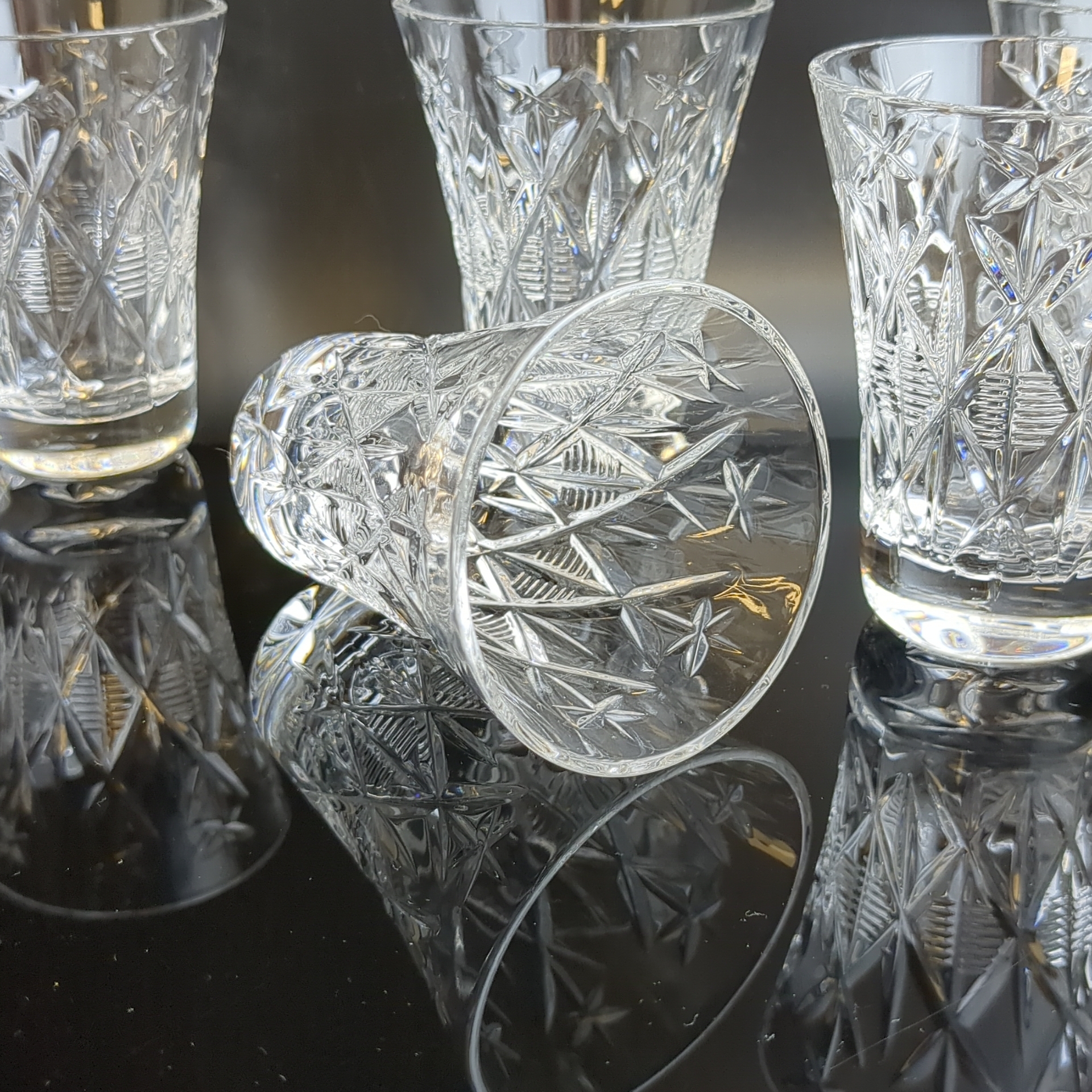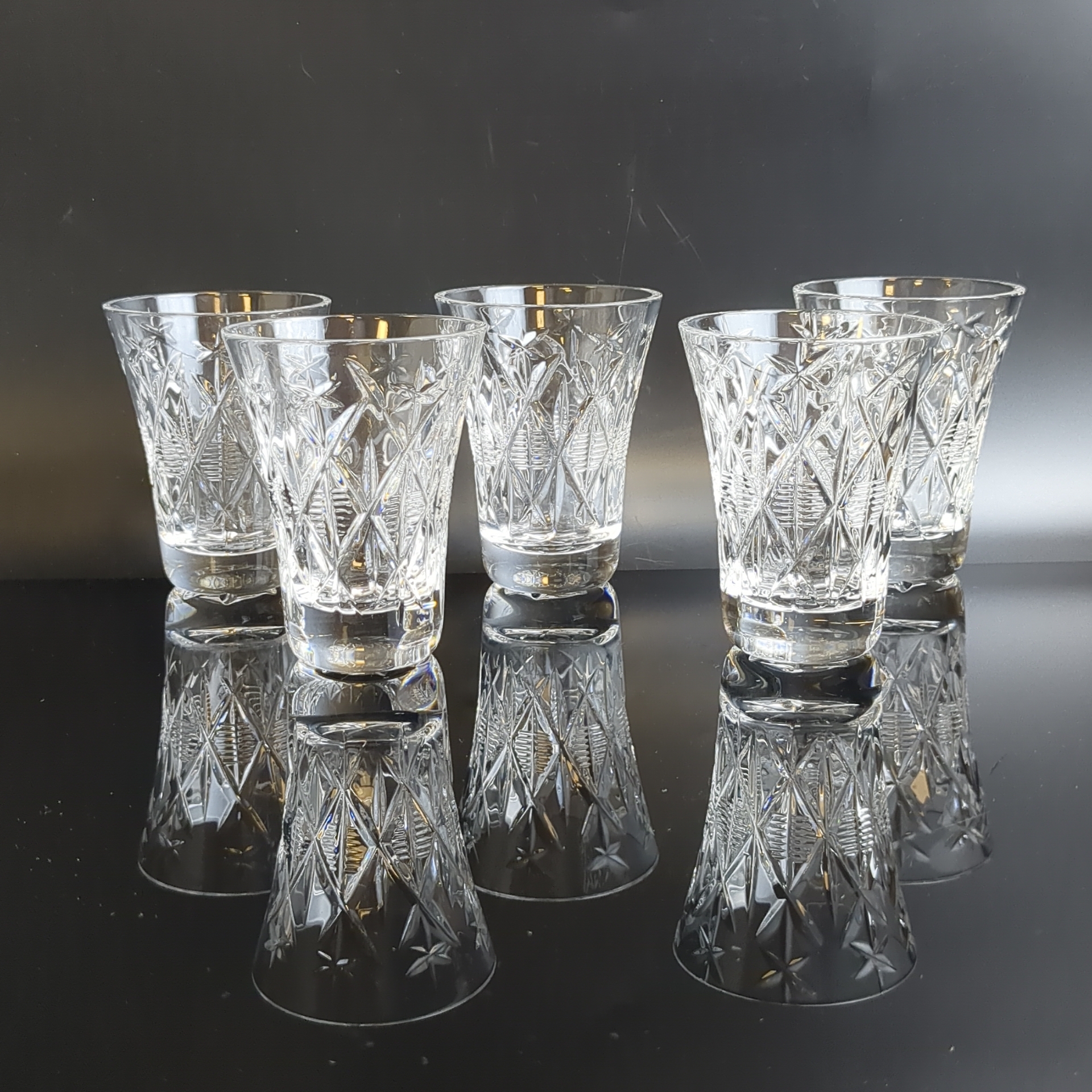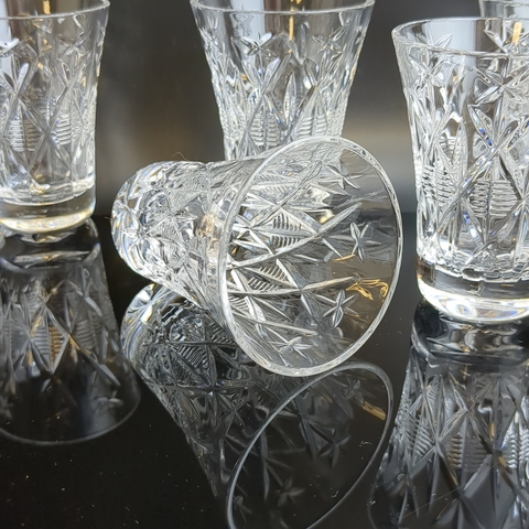 Стопки хрустальные набор из 5 штук, алмазная грань. геометрический орнамент, изящная резьба, винтаж СССР 1970-1990 гг. Высота - 8 см. Состояние на фото