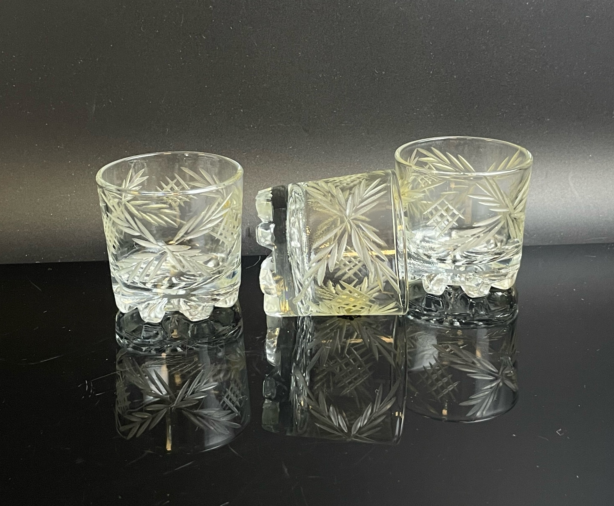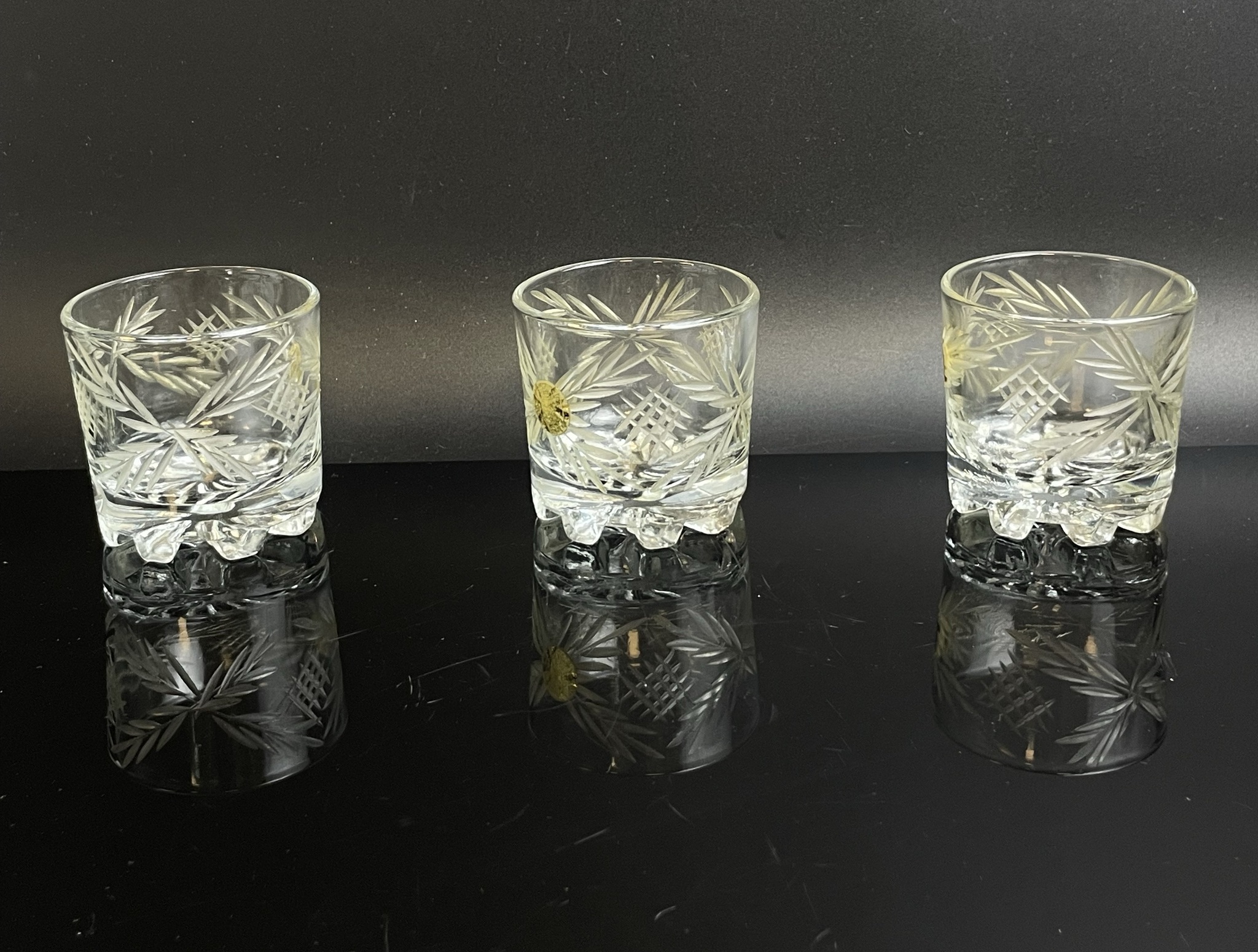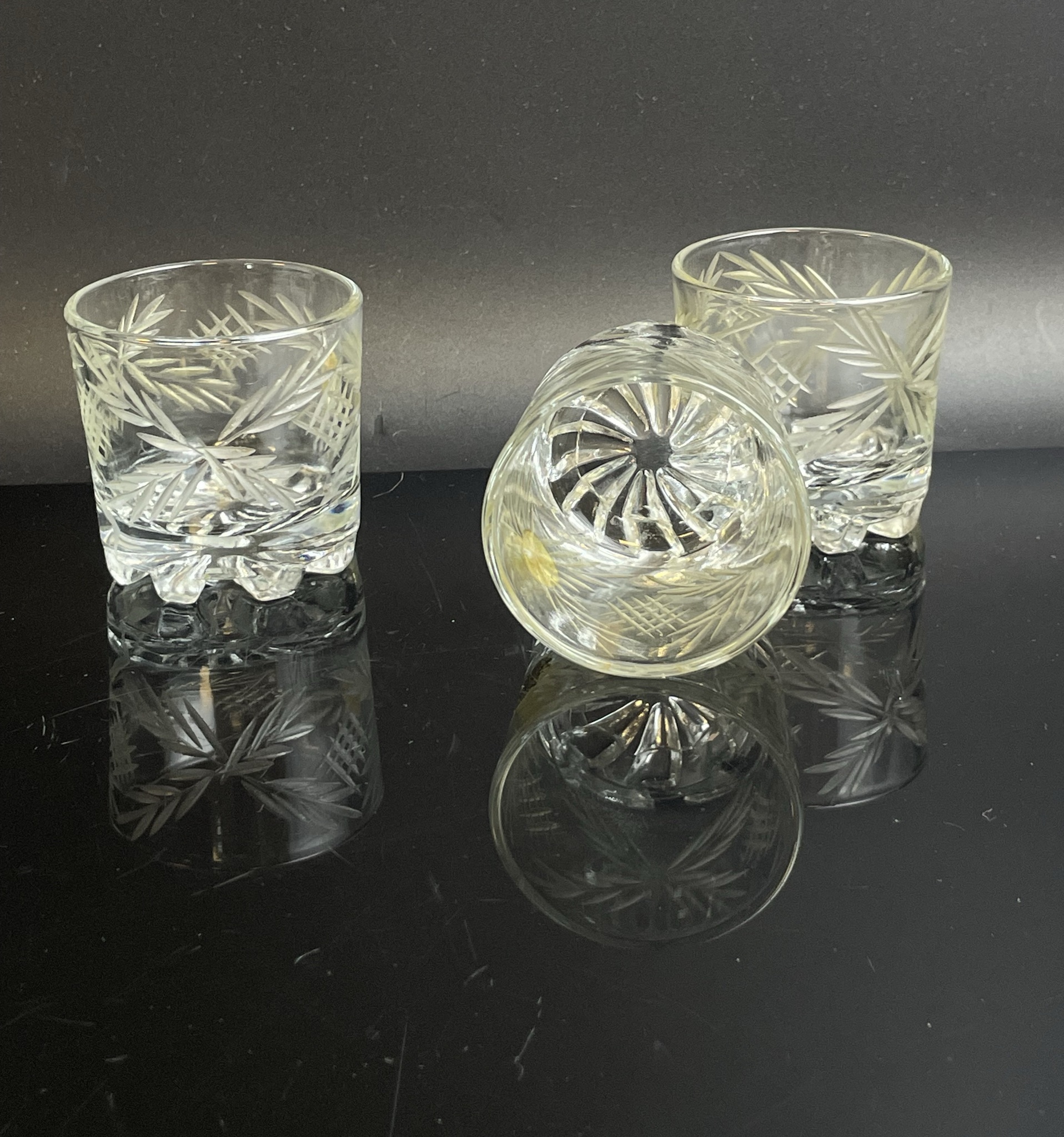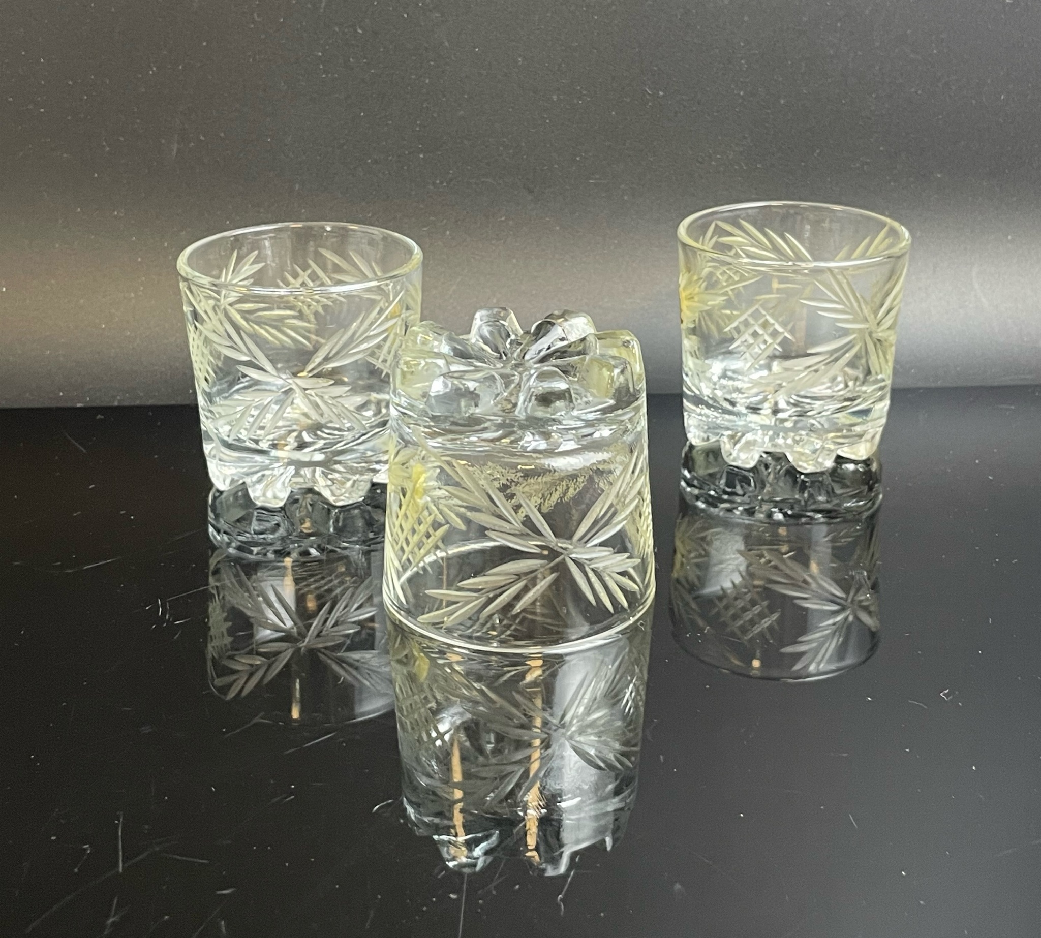 Стопки набор из 3 штук стекло, граненый орнамент, высота - 5 см, 50 мл., ГХЗ завод, винтаж СССР 1970-1990 гг. Присутствуют следы использования- состояние на фото.