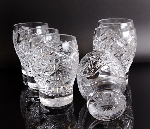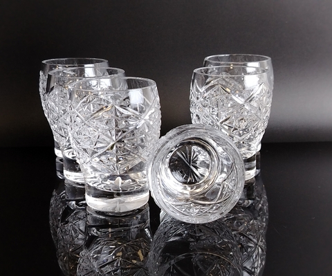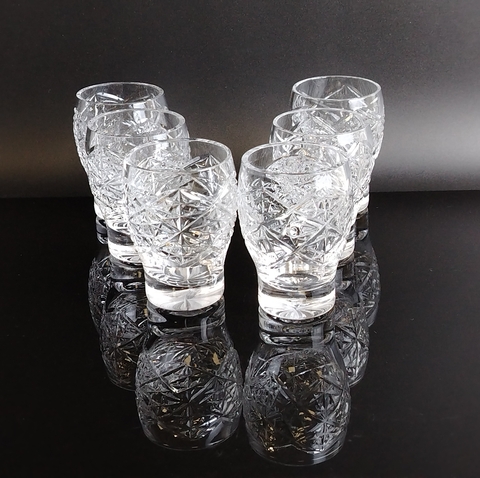 Стопки набор из 6 штук хрустальные в виде бочонков, алмазная грань, геометрический орнамент, винтаж СССР 1970-1990 гг. Высота - 8 см. Состояние и комплектация на фото