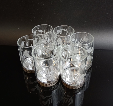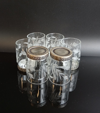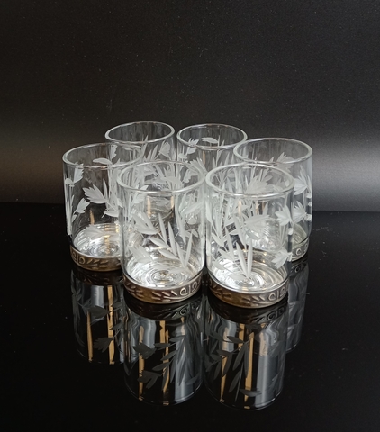 Стопки набор из 6 штук, стекло, 50 мл., резной растительный декор, металл, винтаж СССР 1960-1990 гг. Высота - 5 см. Присутствуют следы использования - состояние на фото