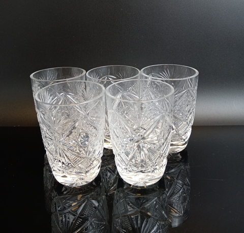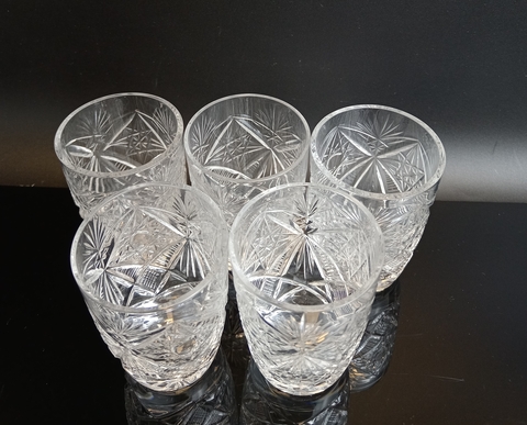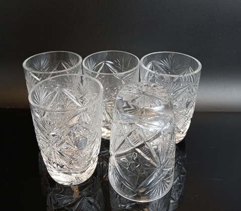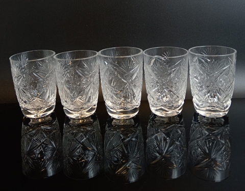 Стопки, стаканы хрустальные набор из 5 штук алмазная грань, геометрический орнамент, винтаж СССР 1970-1990 гг. Высота - 8 см. 125 мл.