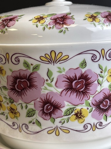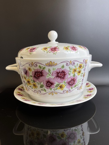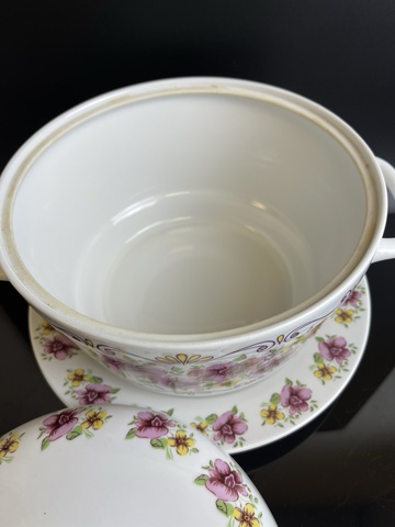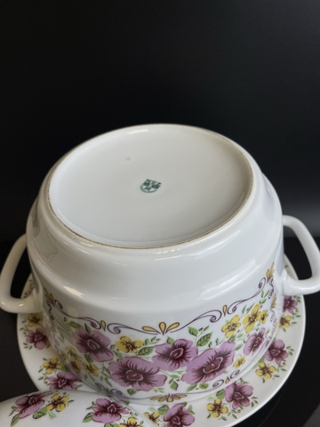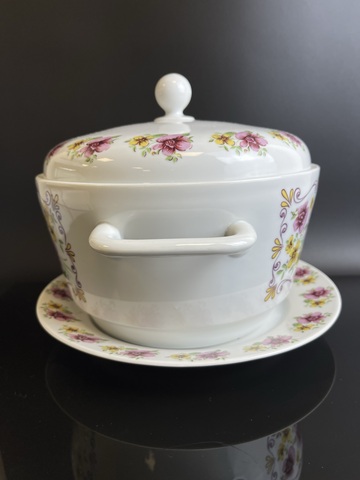 Супница с блюдом подставкой фарфоровая, Чехословакия, MZ Moritz Zdekauer, цветы, винтаж времен СССР 1955-1980 гг. Высота супницы вместе с тарелкой - 20 см, ширина - 26 см. Вес -2.168 кг. Присутствуют следы использования - состояние на фото