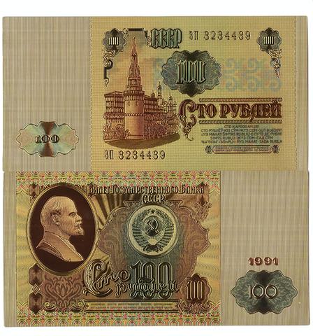 Сувенир 100 рублей СССР 1991 года Ленин Позолоченная купюра Цветная Банкнота под золото (Бона) Копия