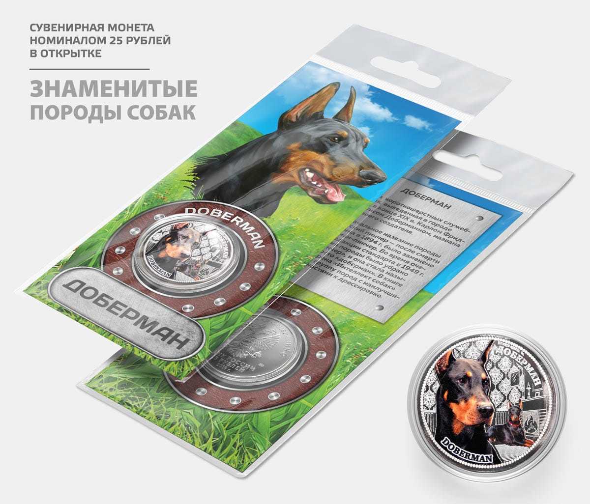 Сувенирная монета 25 рублей "Доберман" цветная с гравировкой в подарочной открытке