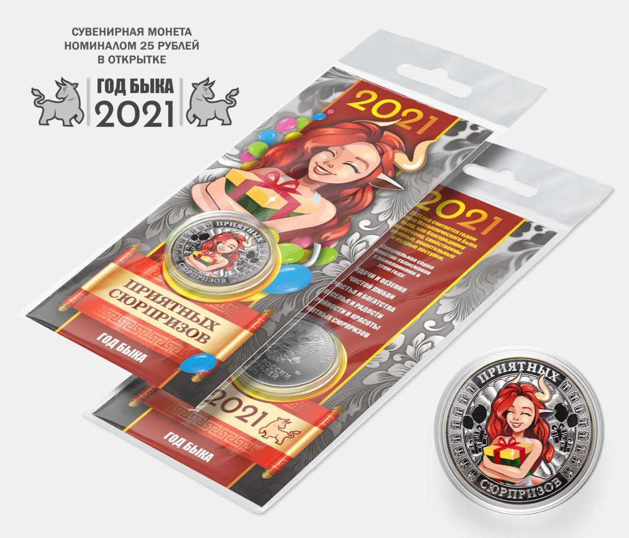 Сувенирная монета 25 рублей. Год Быка 2021 - Приятных сюрпризов. В подарочной открытке