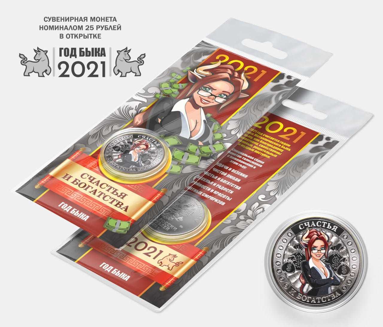 Сувенирная монета 25 рублей. Год Быка 2021 - Счастья и богатства. В подарочной открытке