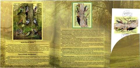Сувенирный набор в художественной обложке «Фауна России. Дятлы». Квартблок, виньетка, конверт первого дня с гашением. Буклет