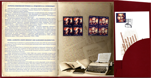 Сувенирный набор в художественной обложке «Лауреаты нобелевской премии И.А. Бродский и А.И. Солженицын». 2 квартблока, конверт первого дня со спецгашением. В буклете