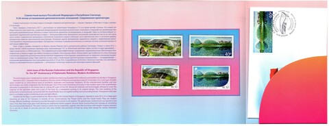 Сувенирный набор в художественной обложке «Совместный выпуск РФ и Сингапура к 50-летию установления дипломатический отношений». 4 почтовые марки, 2 конверта первого дня с гашением. Буклет