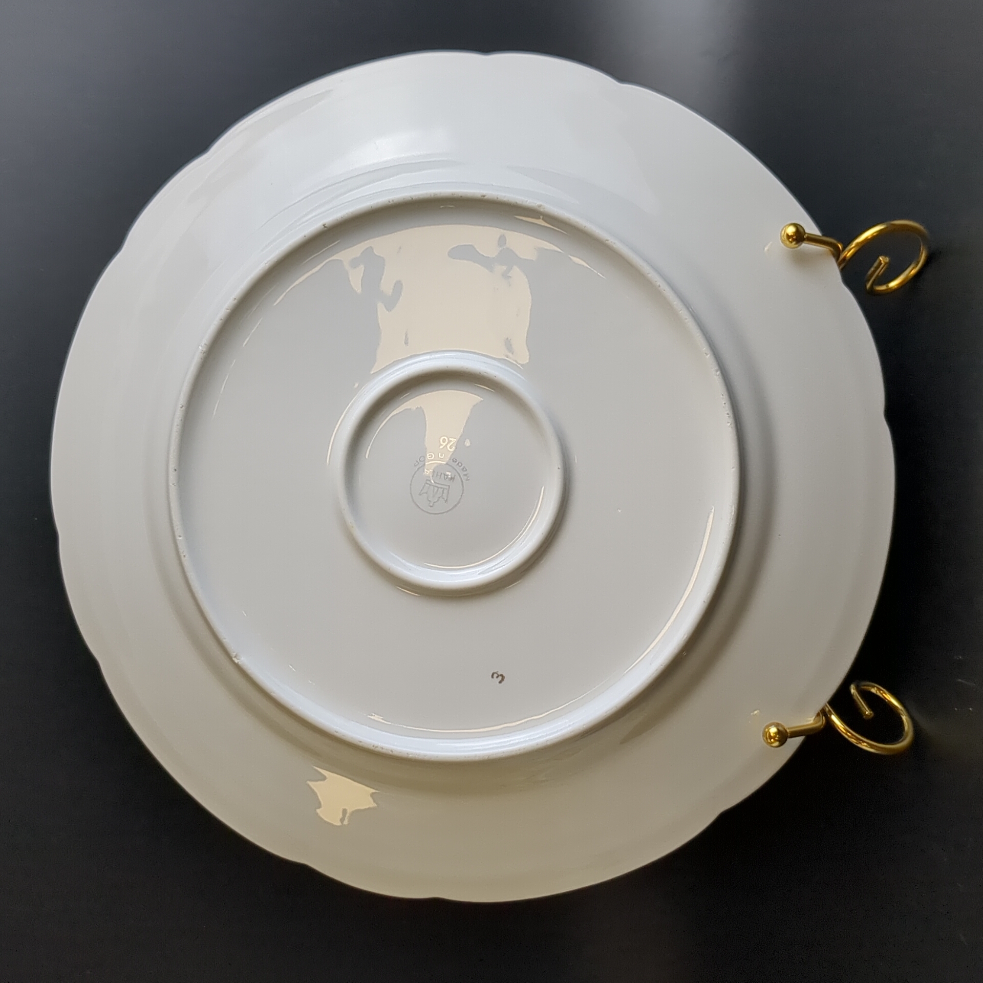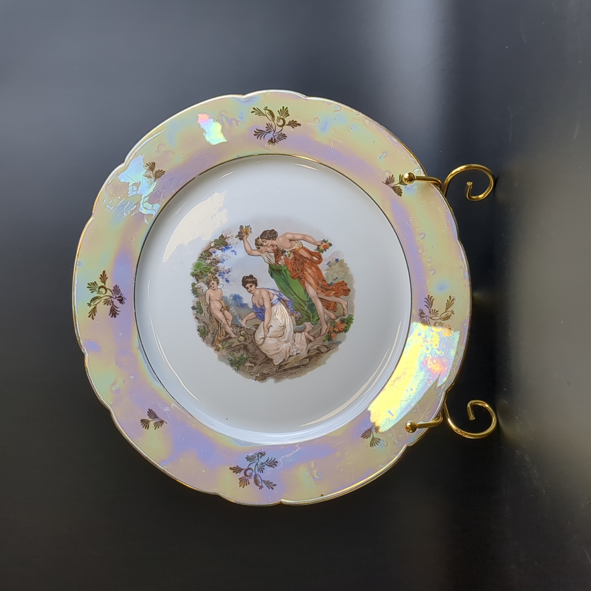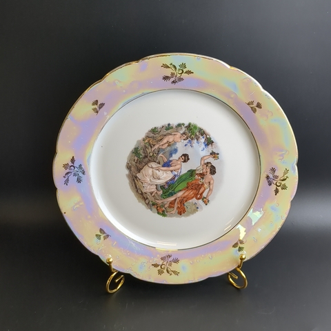 Тарелка для сервировки фарфоровая из сервиза "Мадонна", Kahla GDR, люстр, изображение, золочение, винтаж времён 1970-1990 гг. Диаметр тарелки - 28 см. Состояние на фото - присутствуют следы бытования.