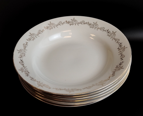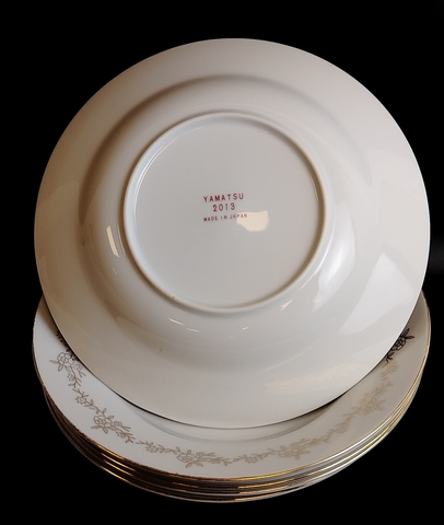 Тарелки суповые набор из 6 штук Yamatsu 2013 Япония, made in Japan, фарфор глубокие, золочение, с стиле винтаж. Высота - 4 см, диаметр - 23 см. Состояние на фото, присутствуют следы бытования - царапинки, позолоченная окантовка чуть стерта