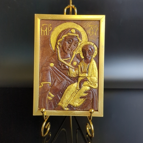 Тихвинская Божья Матерь (Тихвинская икона Богородицы). Старинная деревянная резная икона из красного дерева.