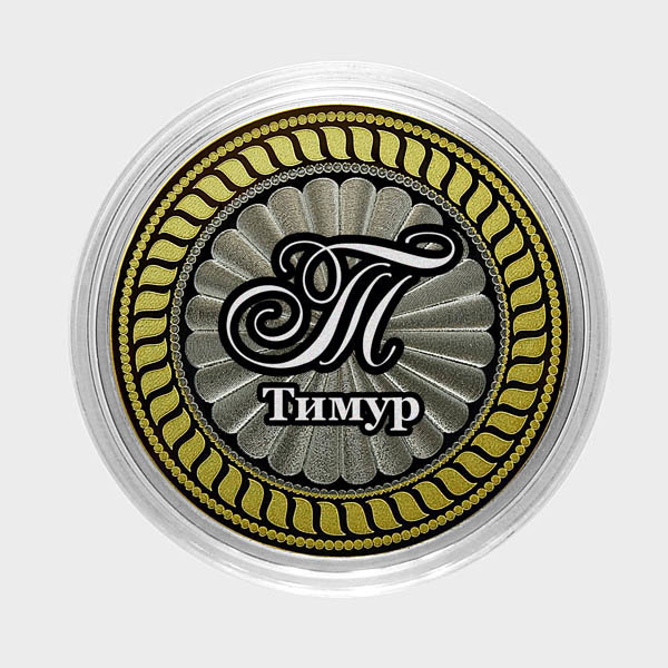 Сувенирная монета "Тимур" номиналом 10 рублей с выгравированным изображением.