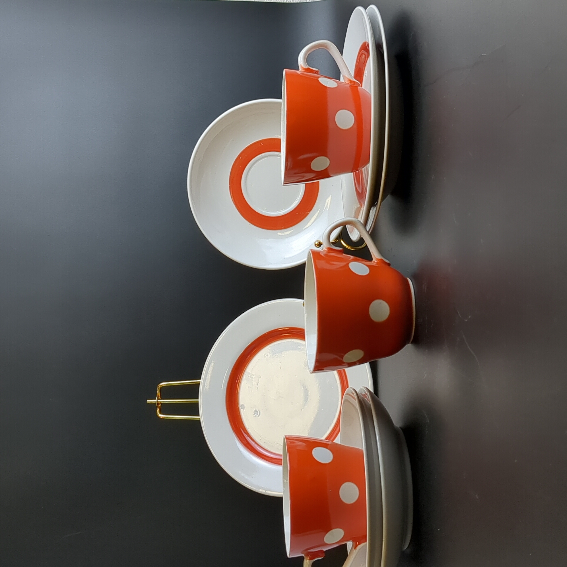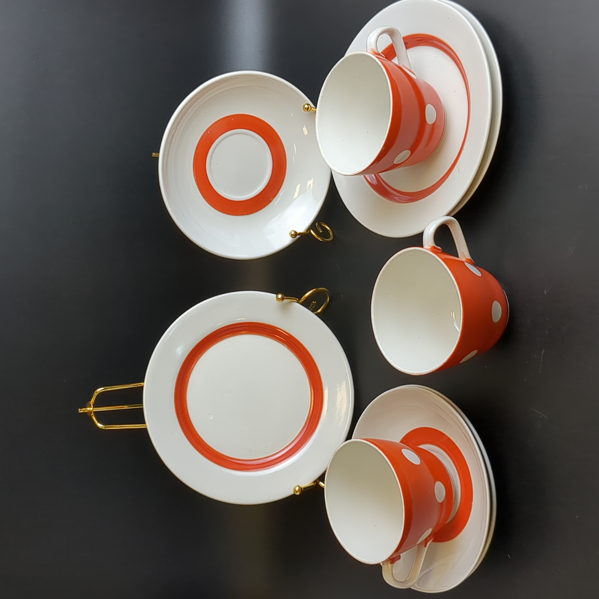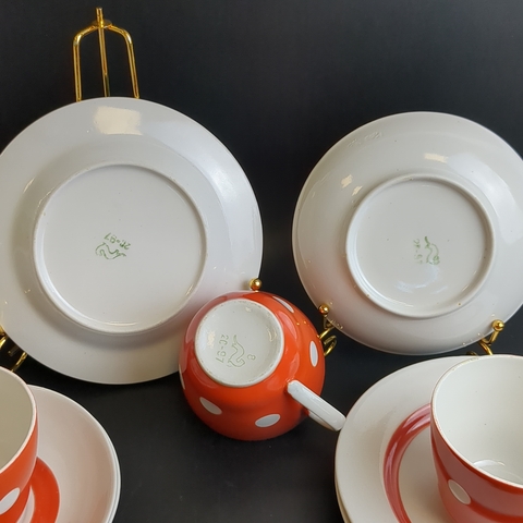 Трио чайное на 3 персоны (9 предметов), фарфор, "Горох" декор, клеймо. Хайтинский ФЗ, винтаж СССР 1980-1991 гг. Диаметры блюдец - 17.5 см и 14.7 см, высота чашечки - 7 см. Состояние и комплектация на фото