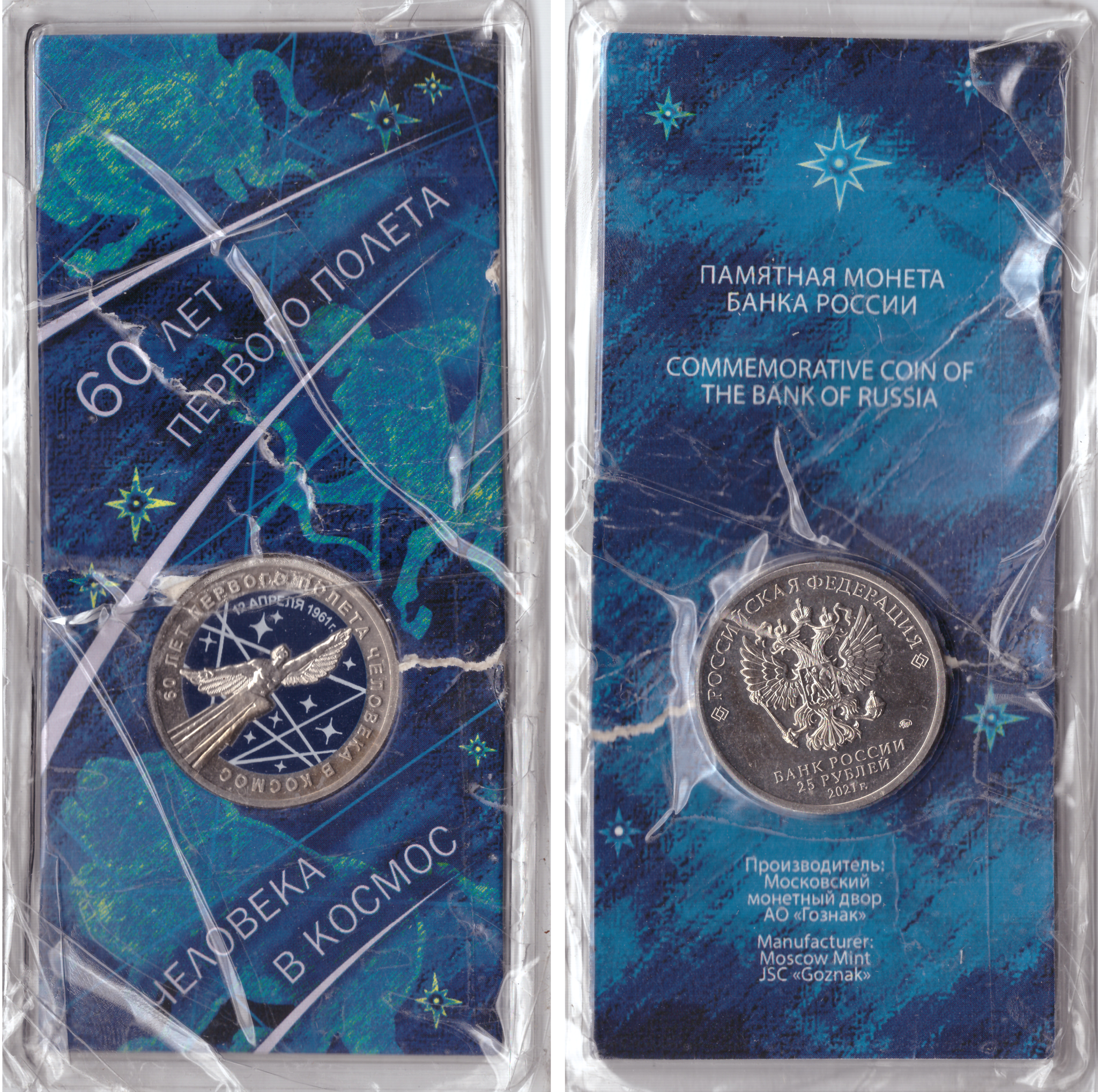 цветная монета 25 рублей 2021 космос 60 лет первого полёта человека в космос в цвете . Монета цветная в блистере. 25 рублей монета России. Коллекционные монеты.
