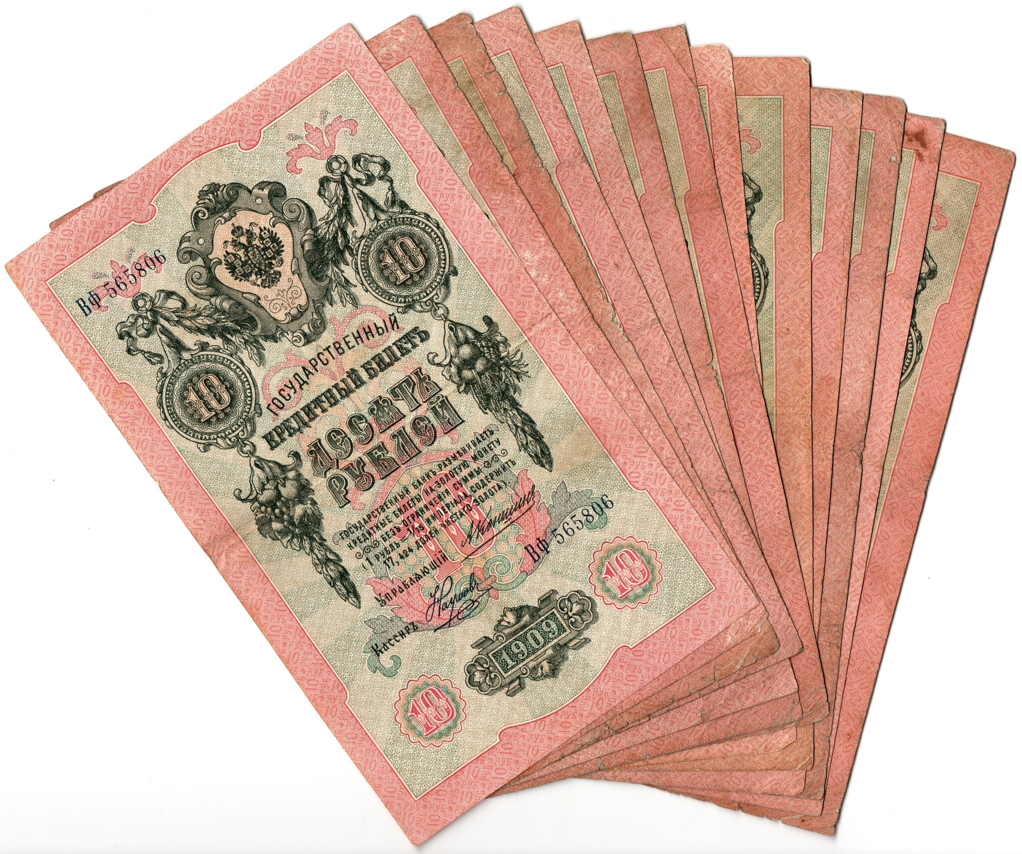 Билет 10 рублей образца 1909 года находился в обращении до 1 октября 1922 года.