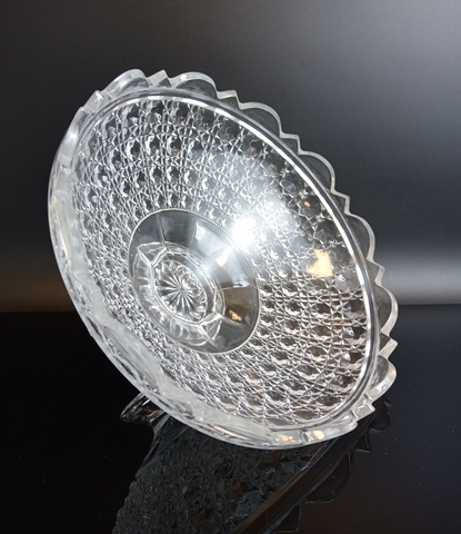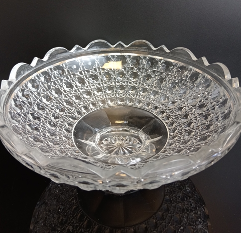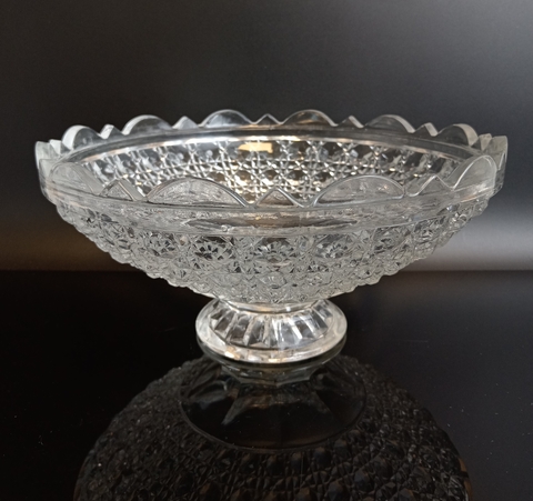 Ваза ажурная фруктовница на ножке хрустальная, резной край, алмазная грань, винтаж СССР 1950-1970 гг. Высота - 11 см, диаметр - 23 см. Присутствуют следы использования - состояние на фото