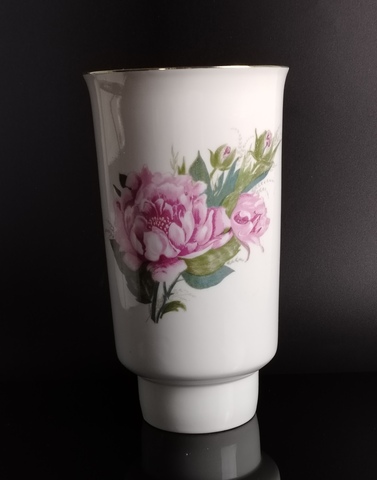 Ваза фарфоровая для цветов Дулево ФЗ клеймо, "Пионы" с позолотой, СССР винтаж 1988 год. Изящная ваза с цветочным декором идеально впишется в любой интерьер. Высота - 22 см, диаметр верха - 12.4 см. Вес- 1 кг. Присутствуют незначительные следы использования - состояние на фото