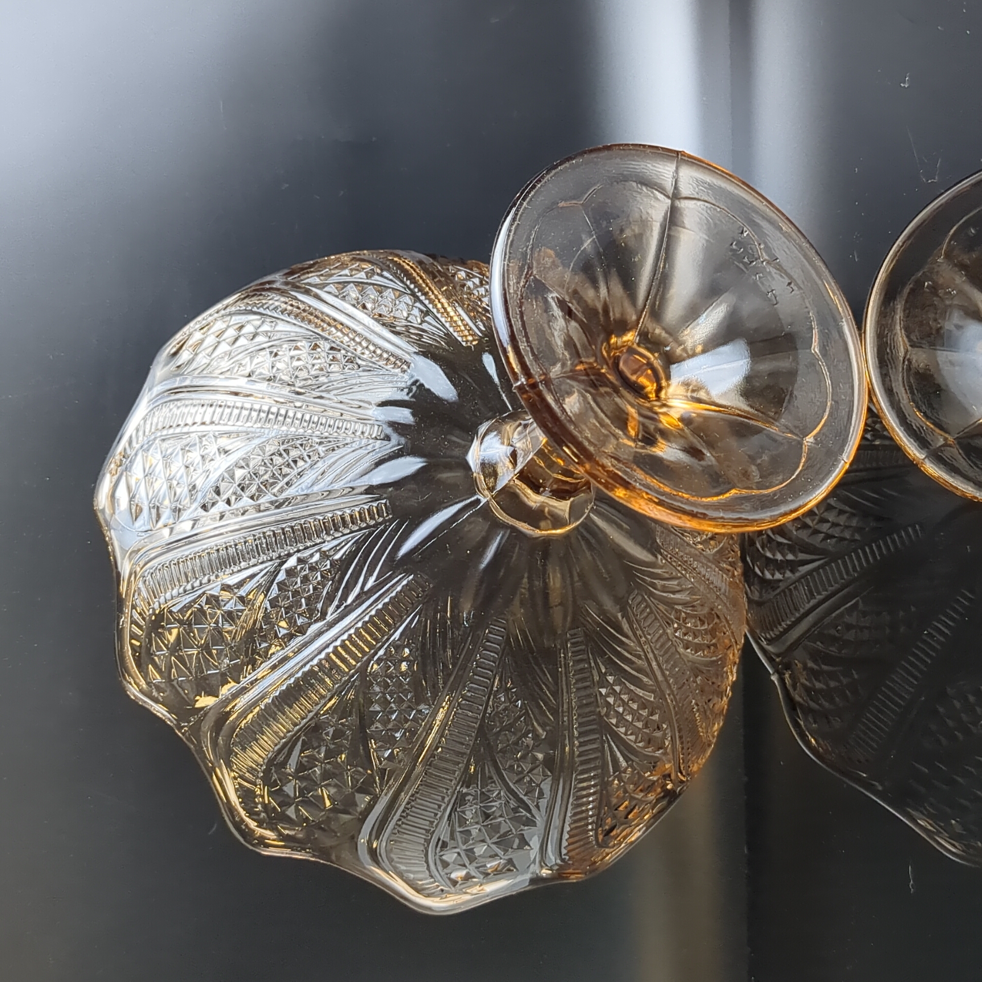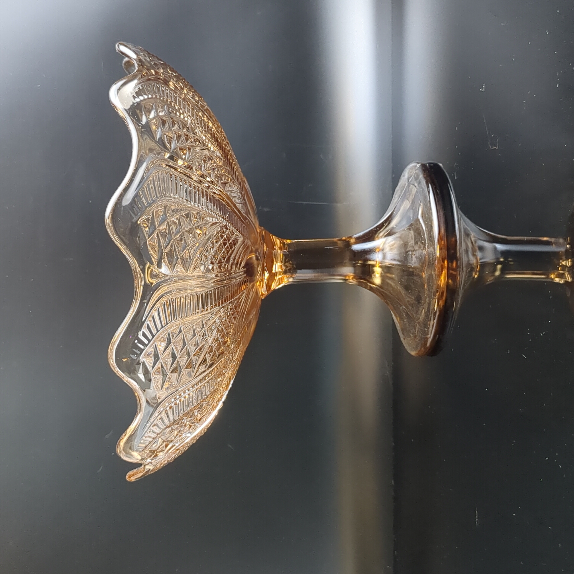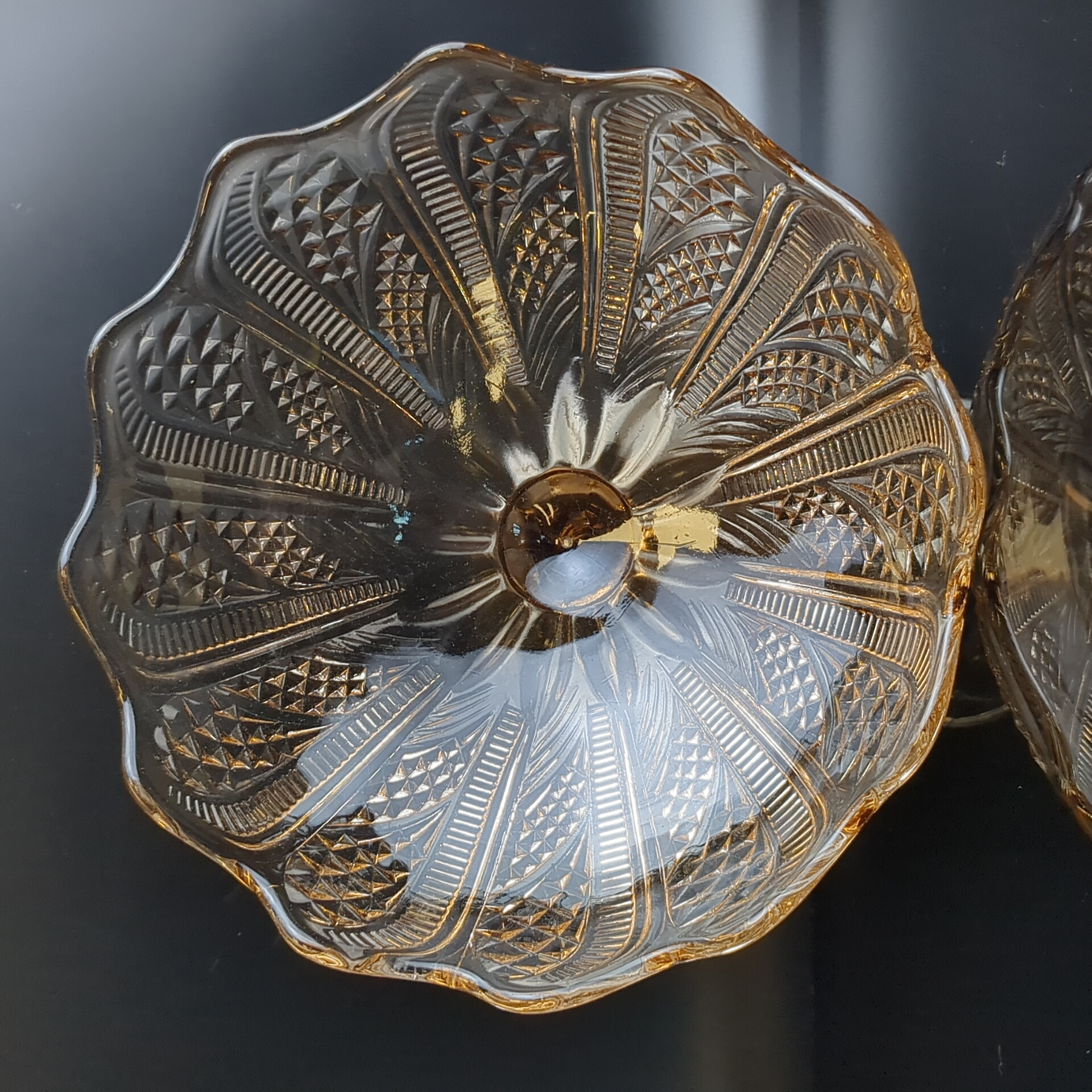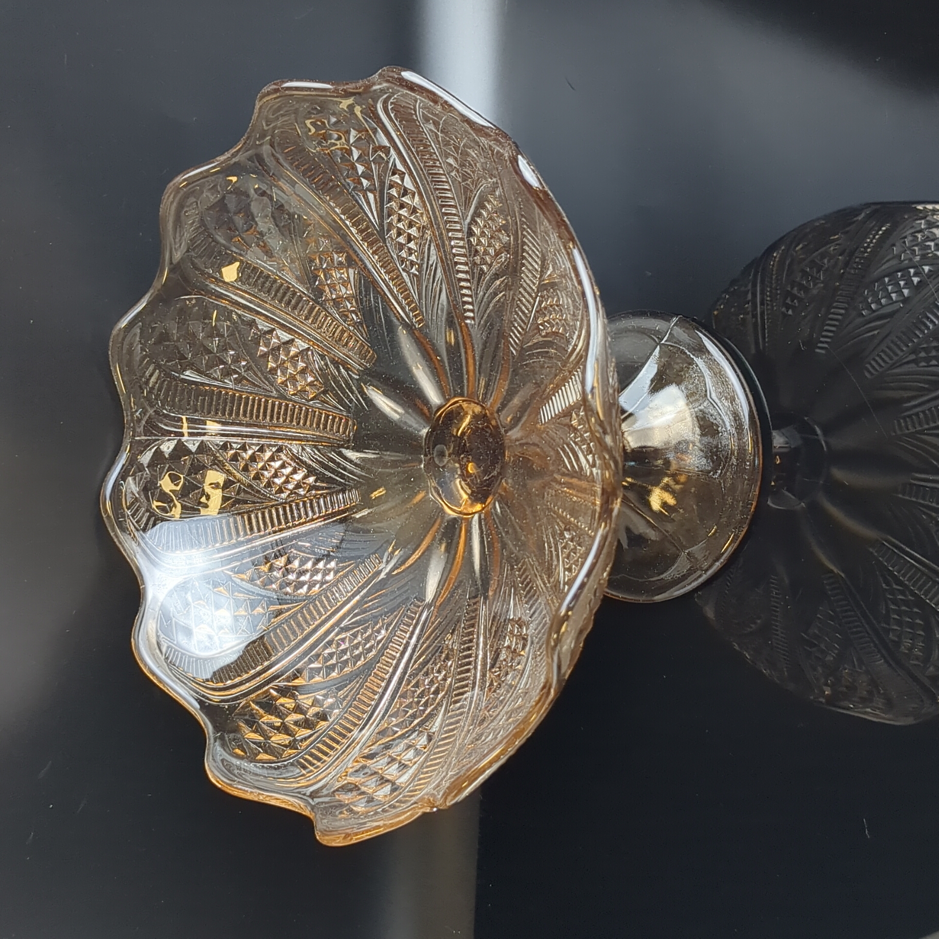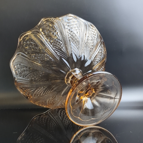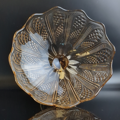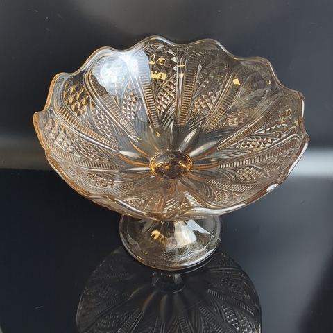 Ваза фруктовница для сервировки на ножке янтарное литое стекло с резным декором, высота -16.5 см, винтаж СССР 1970-1990 гг. Диаметр верха - 23 см. Состояние на фото