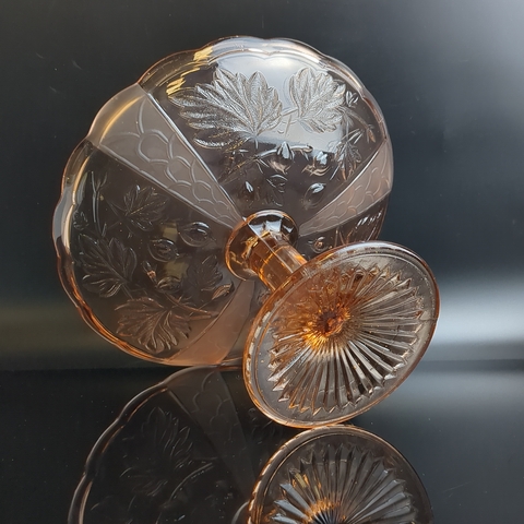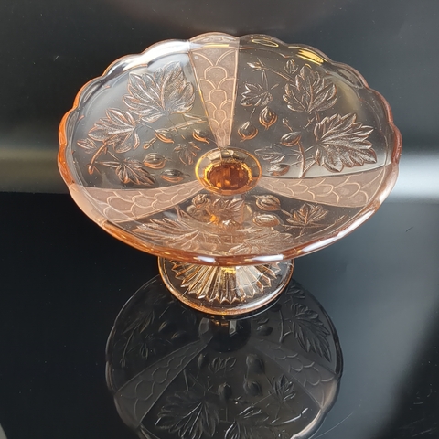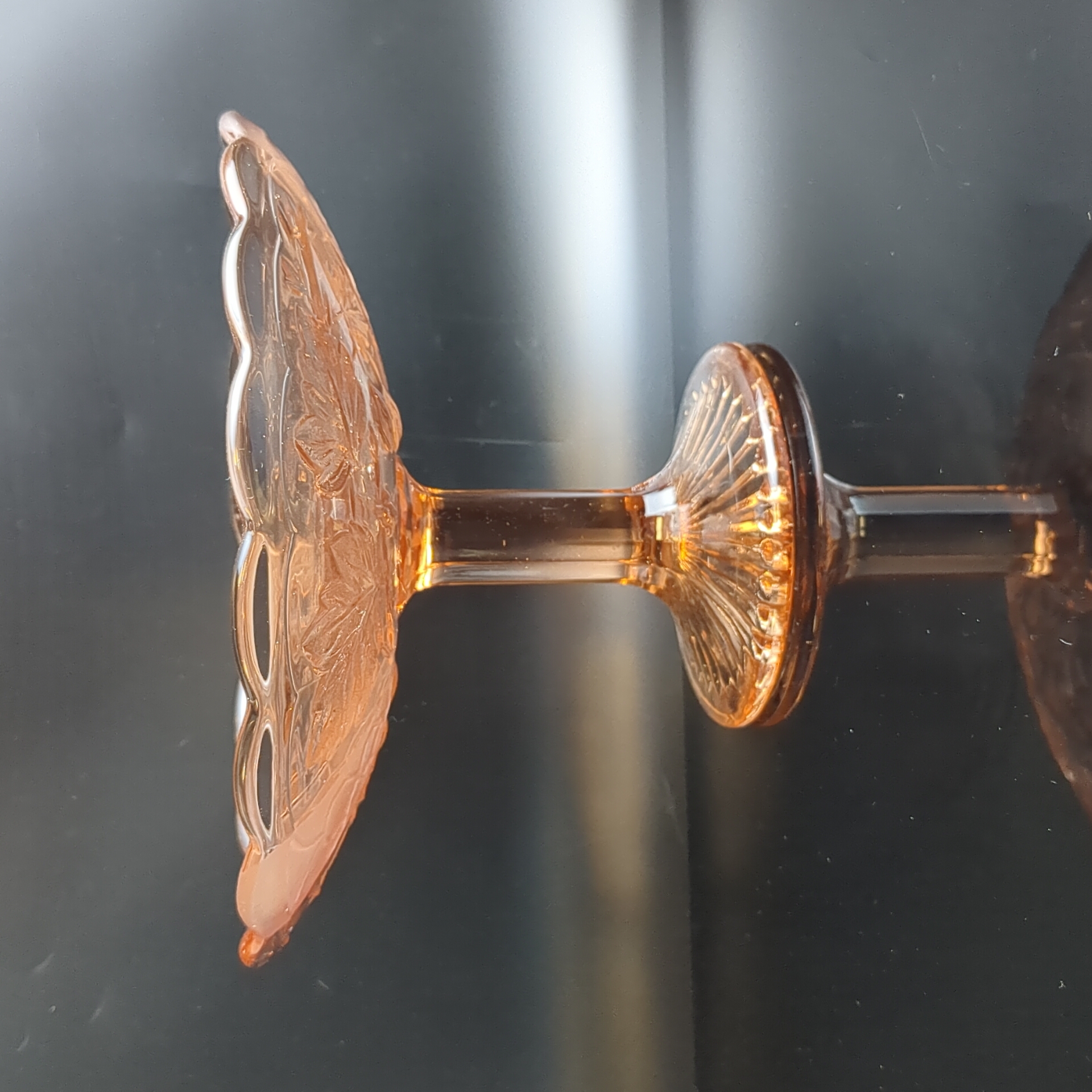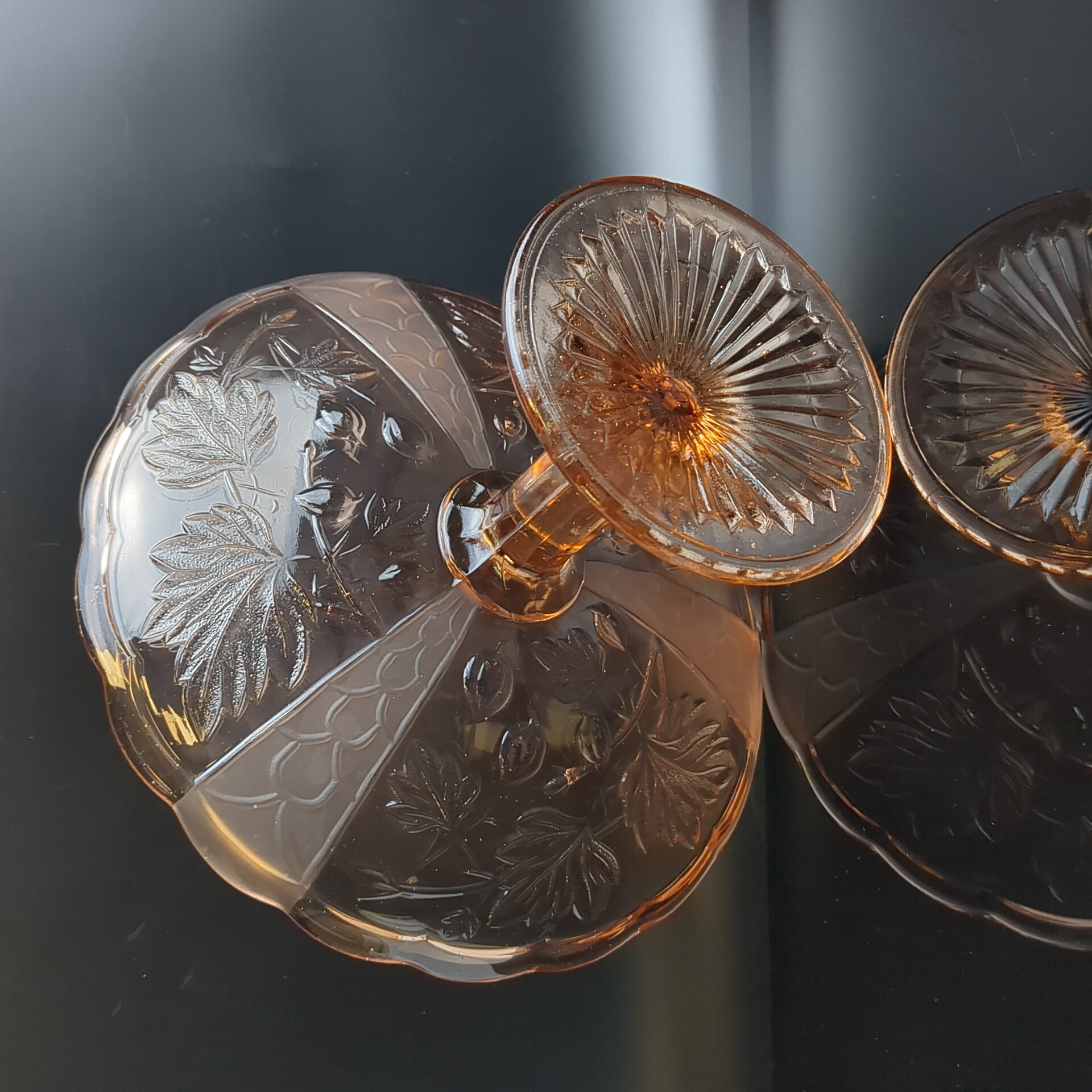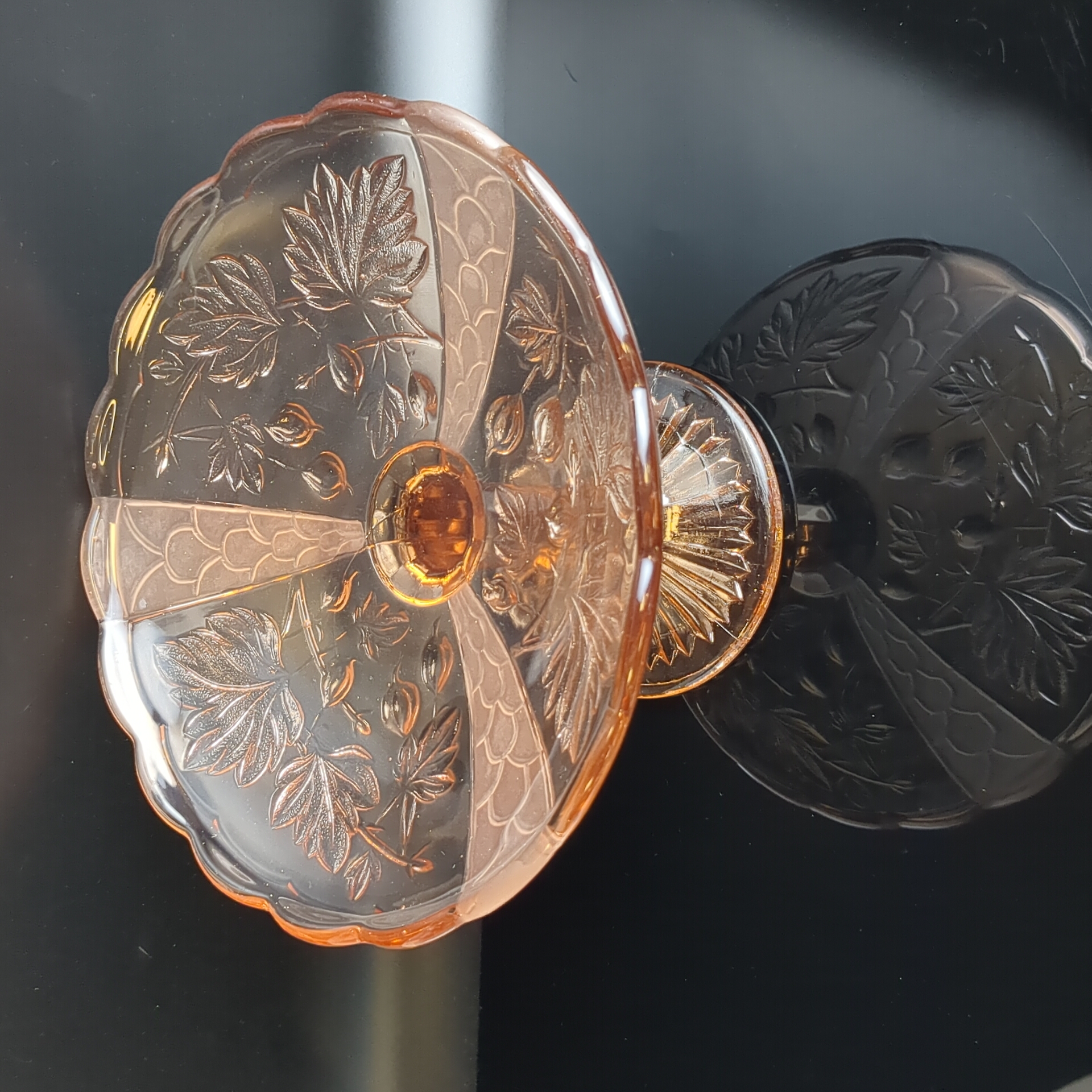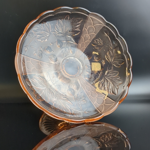 Ваза фруктовница для сервировки на ножке янтарное литое стекло с резным декором, матовая вставка, высота -13 см, винтаж СССР 1970-1990 гг. Диаметр верха - 20.5 см. Состояние на фото