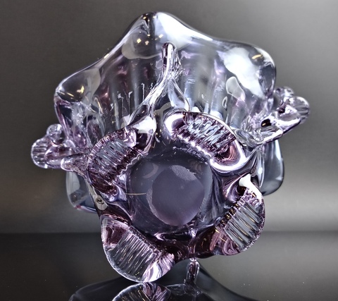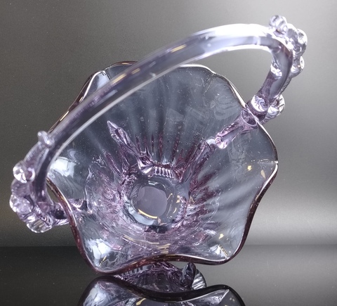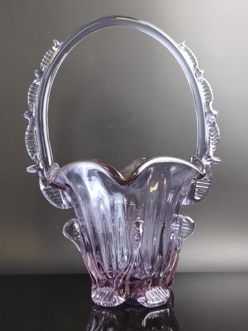 Ваза конфетница изящная в форме корзинки, волнистый борт и рельефная ручка, александритовое цветное стекло, высота - 27.5 см, винтаж СССР 1970-1990 гг. Изящная для интерьера и на подарок. Состояние на фото- присутствуют следы использования.