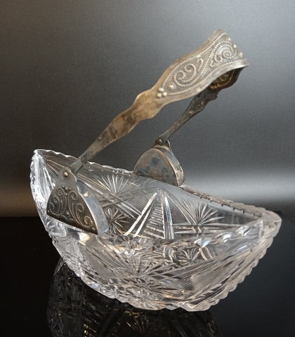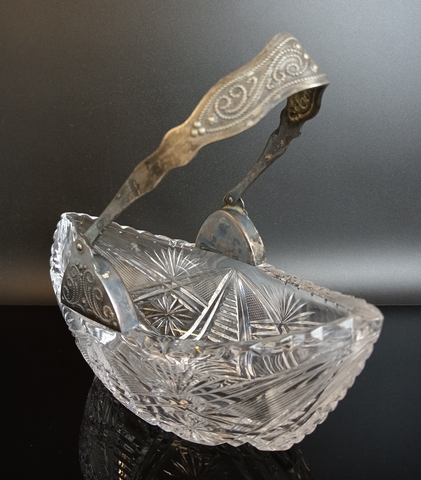 Ваза конфетница ладья с ручкой, хрустальная, алмазная грань, геометрический узор, винтаж СССР 1970-1990 гг. Высота с ручкой - 24 см, высота без ручки - 9 см, длина - 24 см.