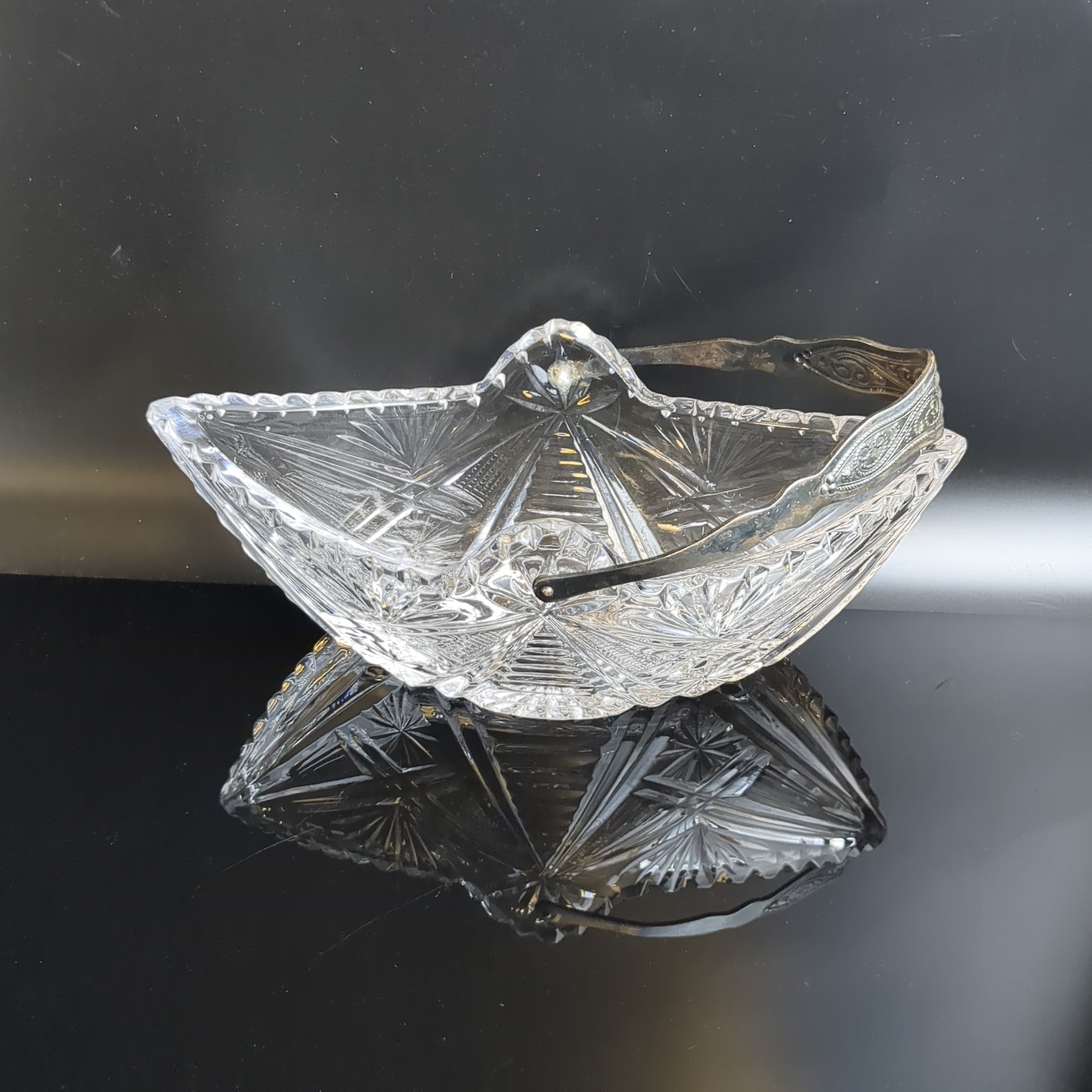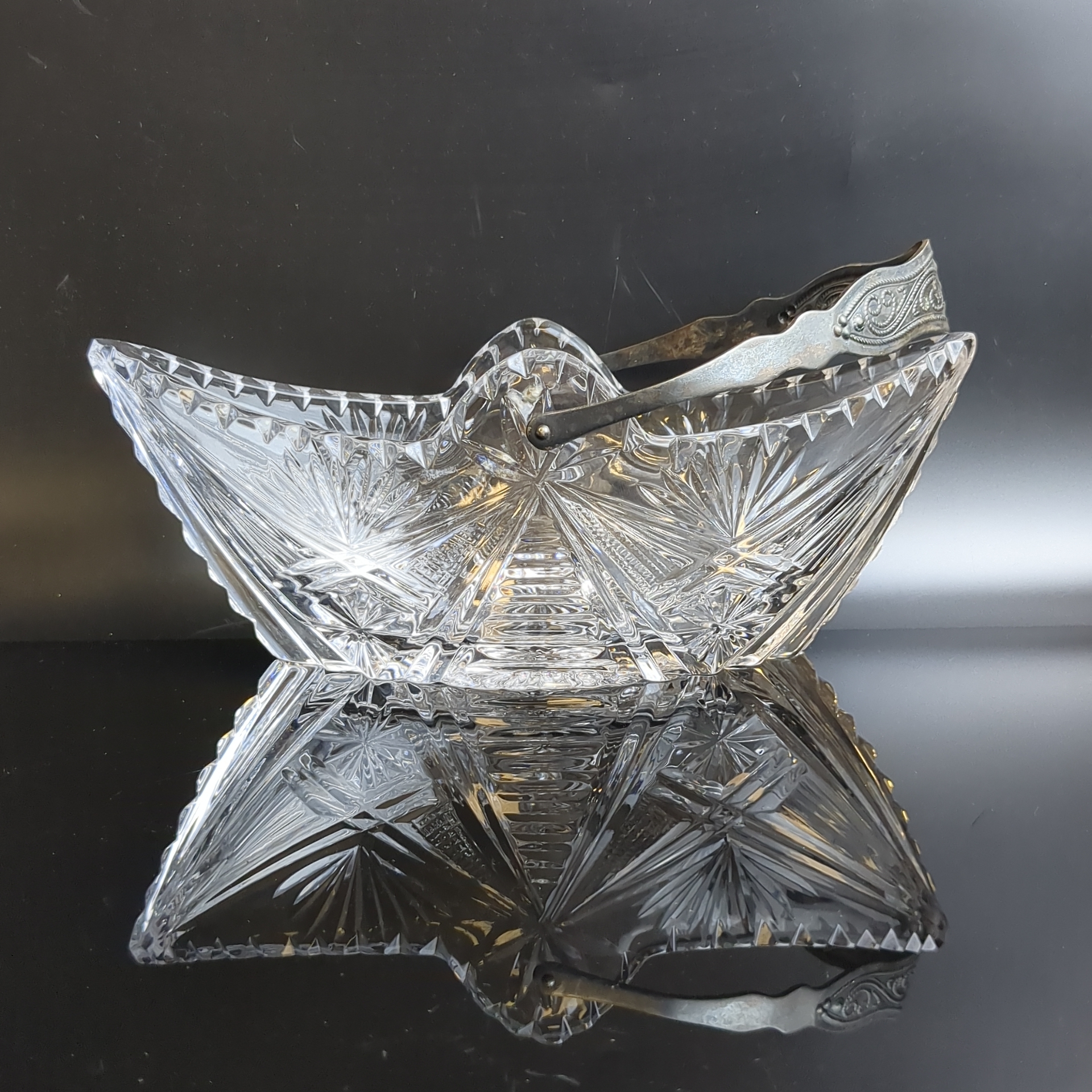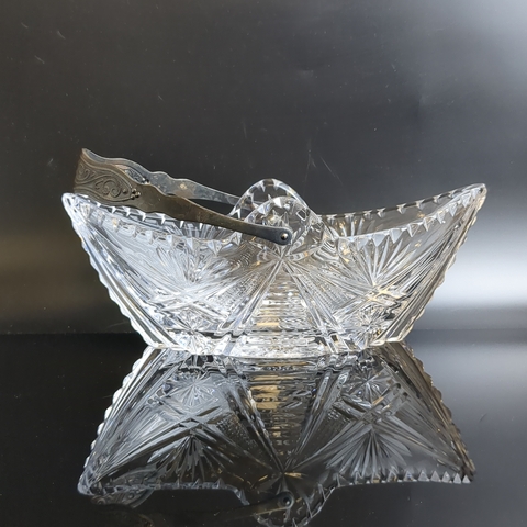 Ваза конфетница ладья с ручкой, хрустальная, алмазная грань, геометрический узор, винтаж СССР 1970-1990 гг. Высота без ручки - 9 см, длина - 24 см.