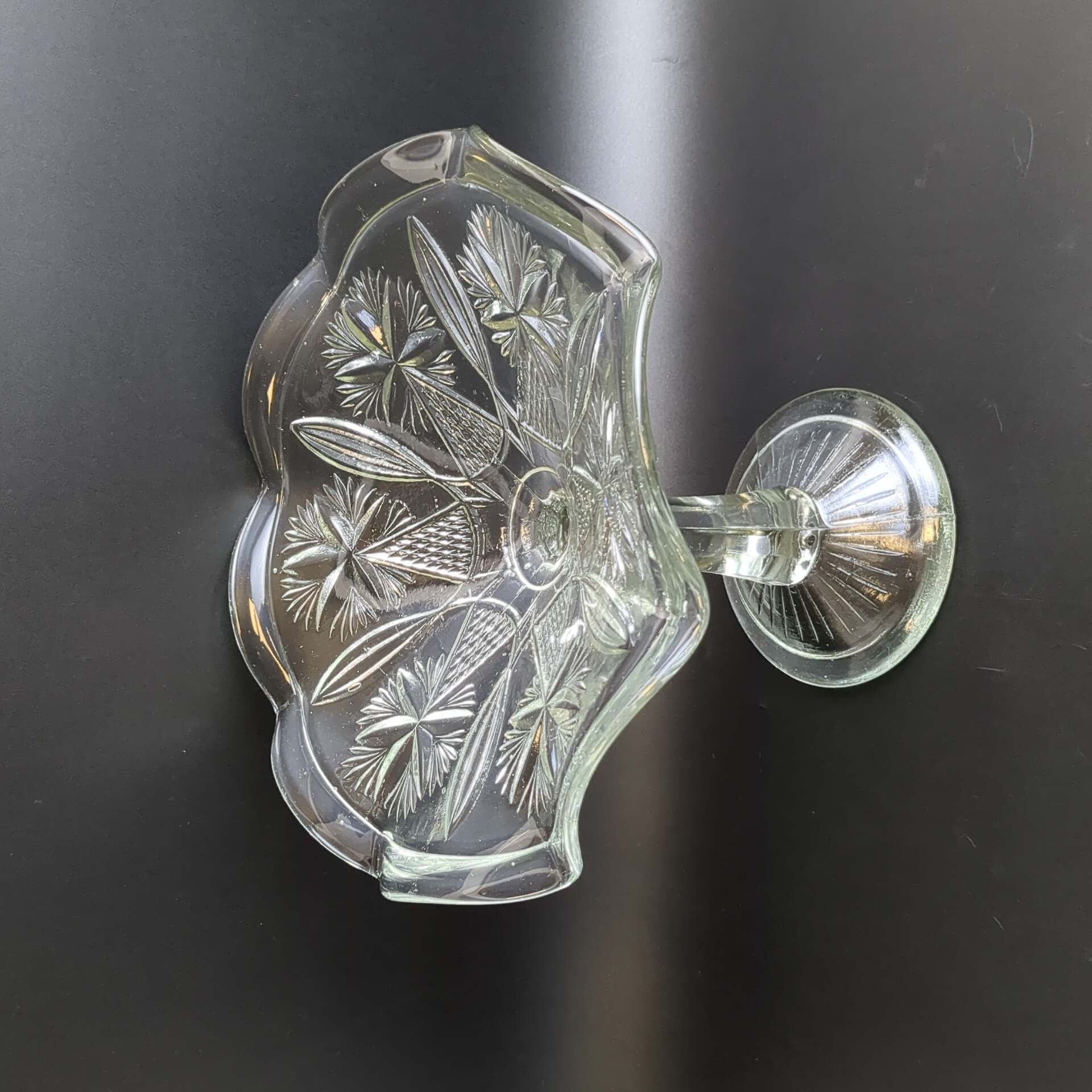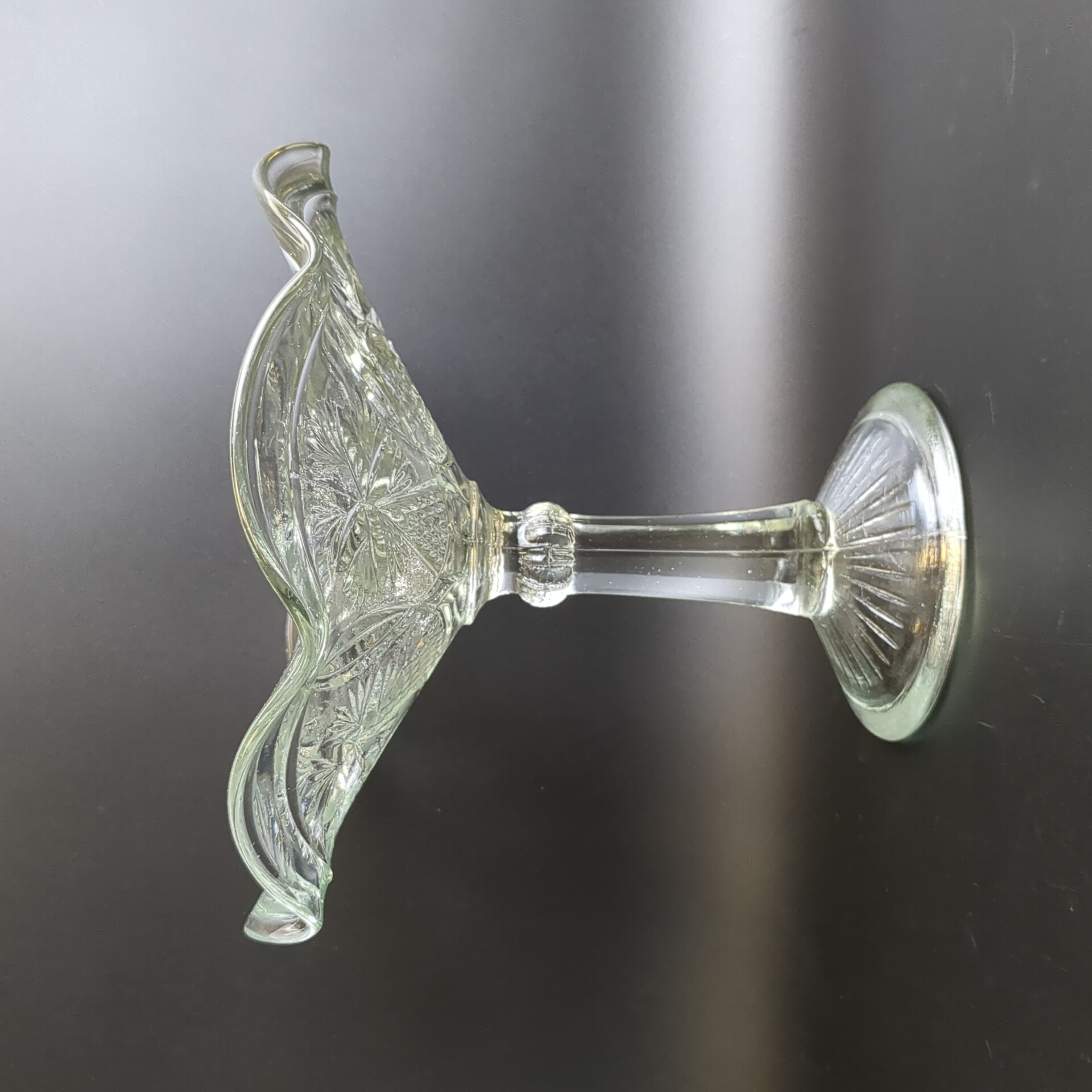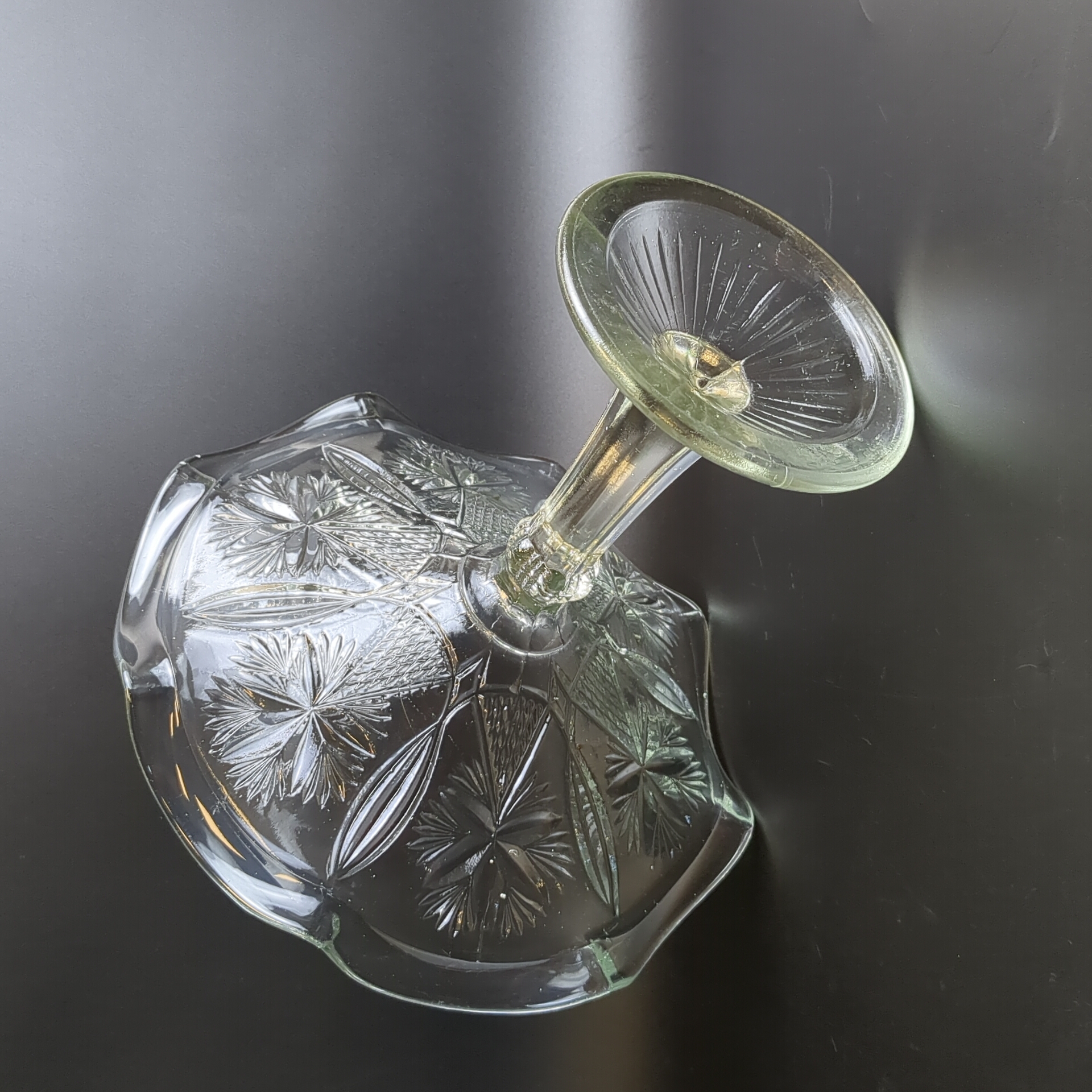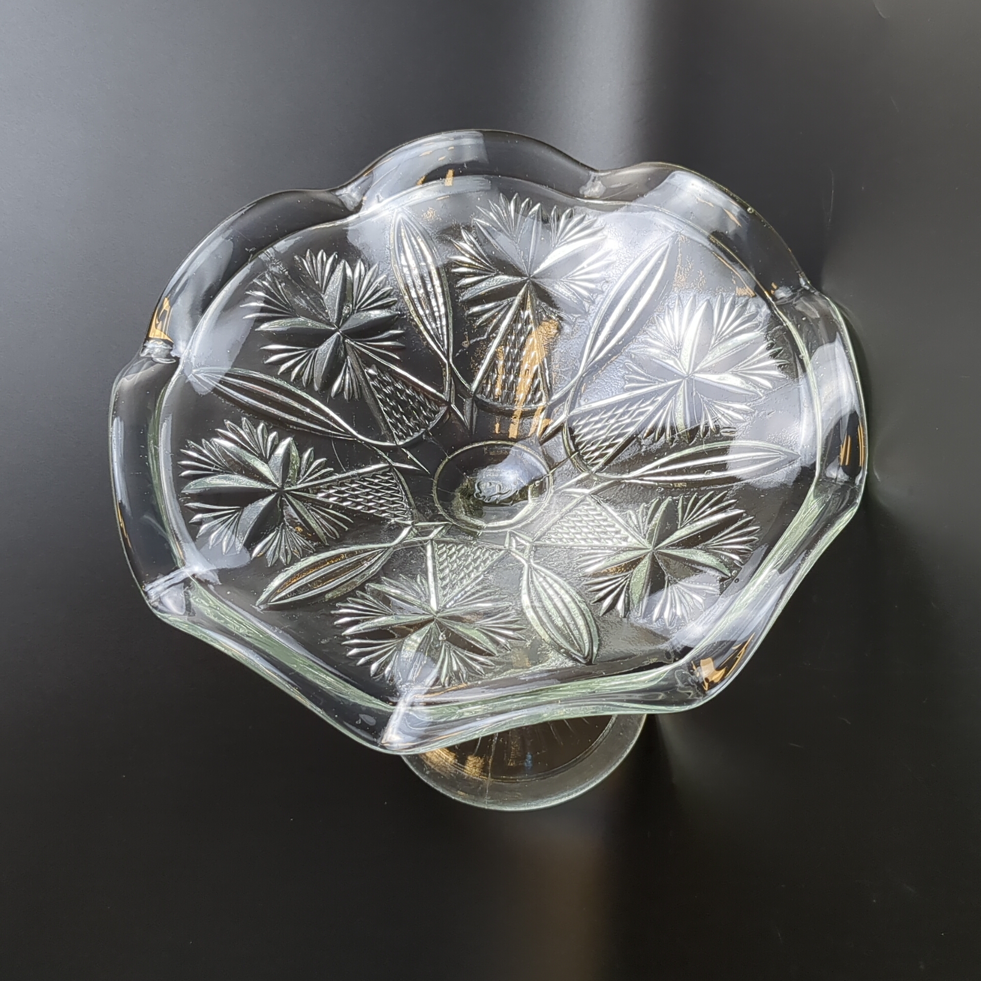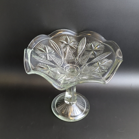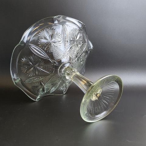 Ваза конфетница на высокой ножке "Васильки" ГХЗ ,с фестончатым краем, прессованное стекло, геометрический декор, винтаж 19- начало 20 века, Царская Россия. Высота - 18.5 см, диаметр - 21.5 см.