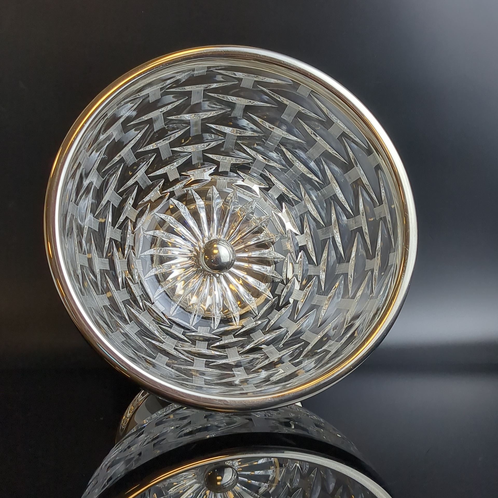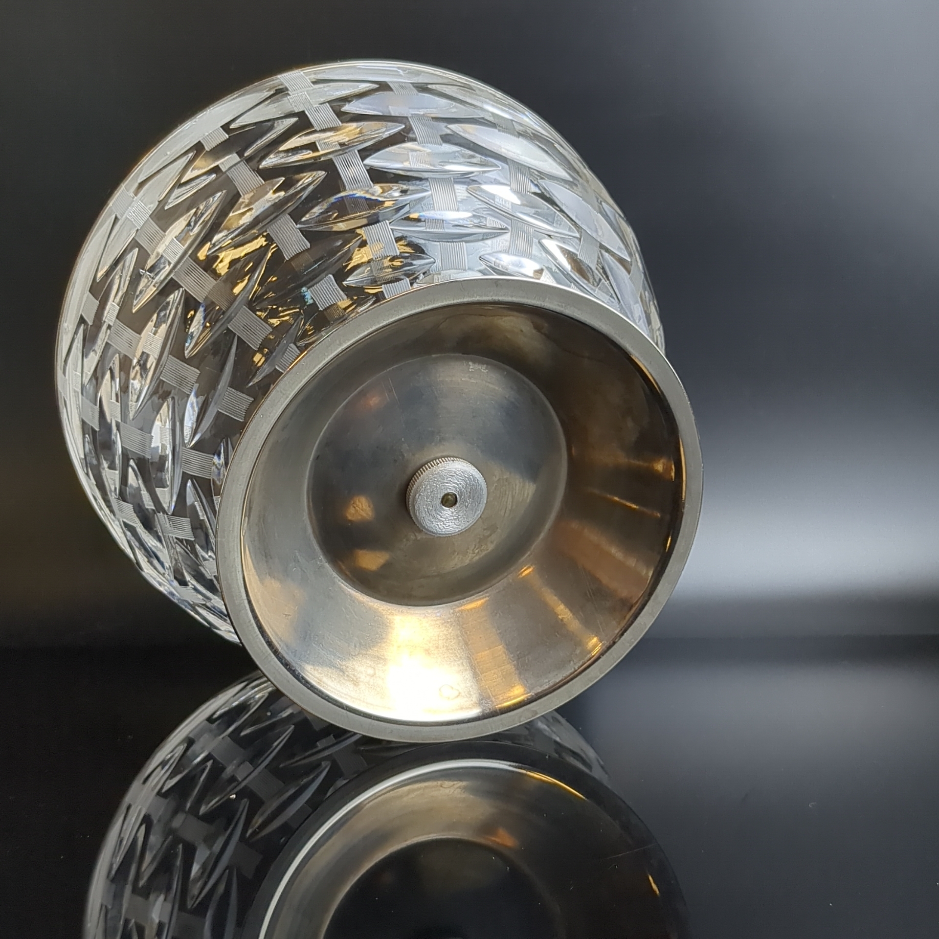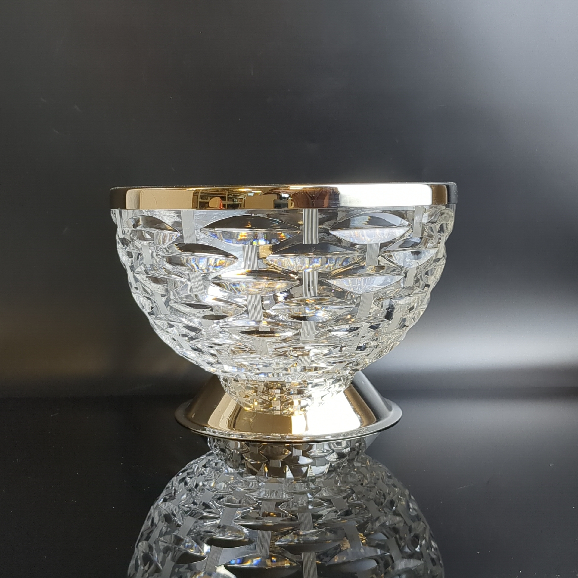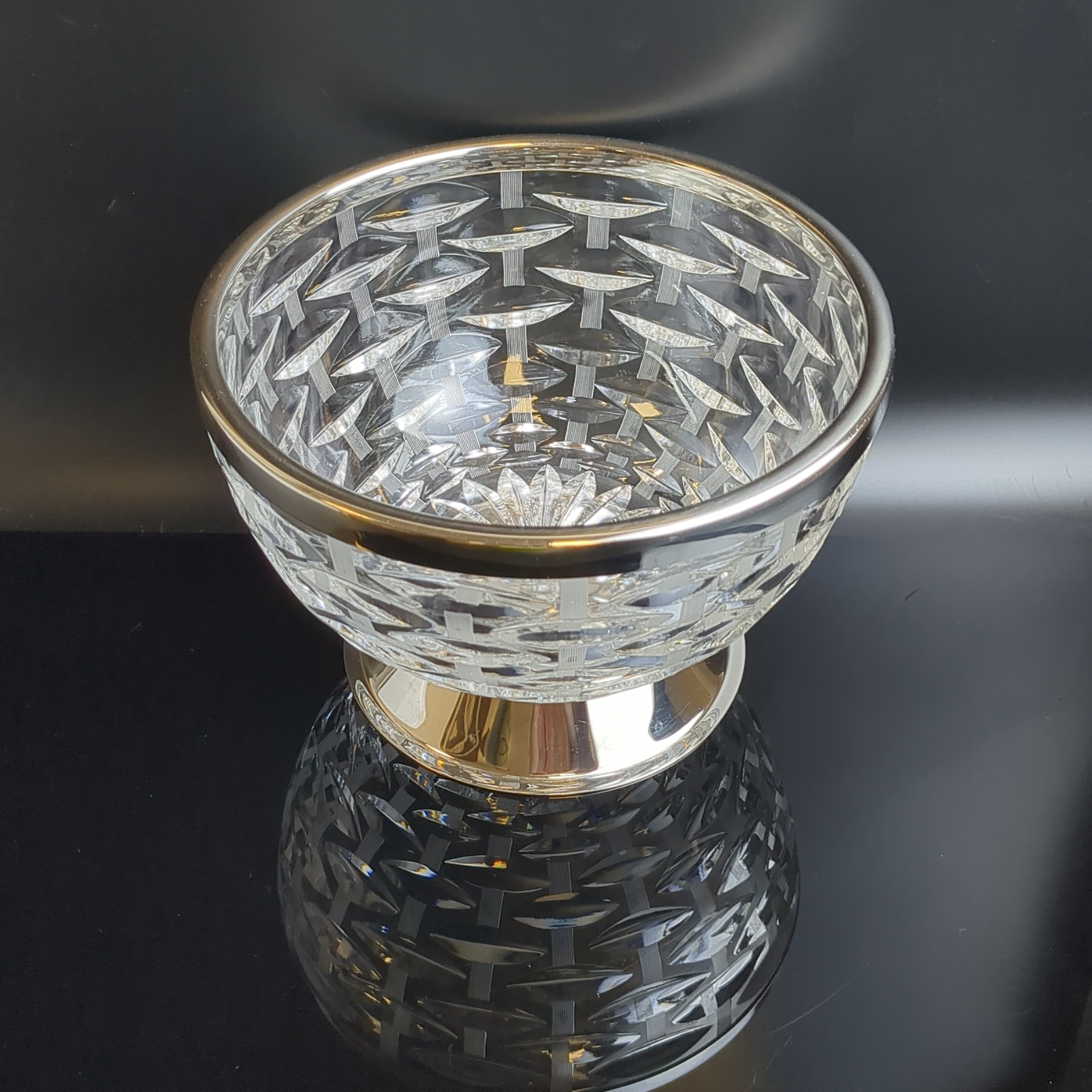 Ваза салатник, конфетница с металлическим ободком на металлической ножкой, хрусталь, алмазная грань, объёмный орнамент, винтаж СССР 1970-1990 гг. Высота - 13.5 см. Диаметр - 19.5 см. Состояние на фото