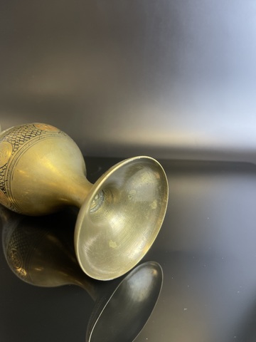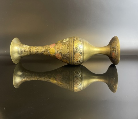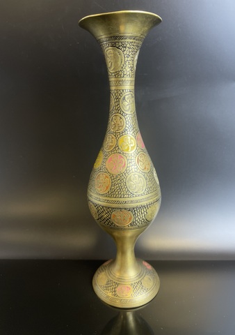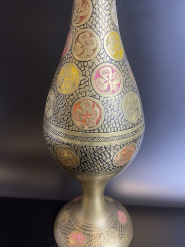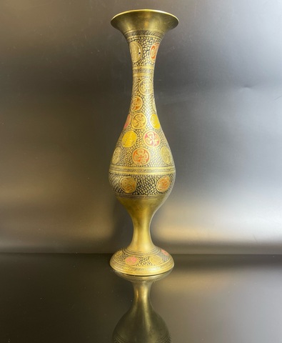 Ваза винтажная декоративная латунь, украшенная цветочным декором, гравировка, краска, Индия 1970-1990 гг. Высота - 24 см. Присутствуют незначительные следы бытования, состояние на фото