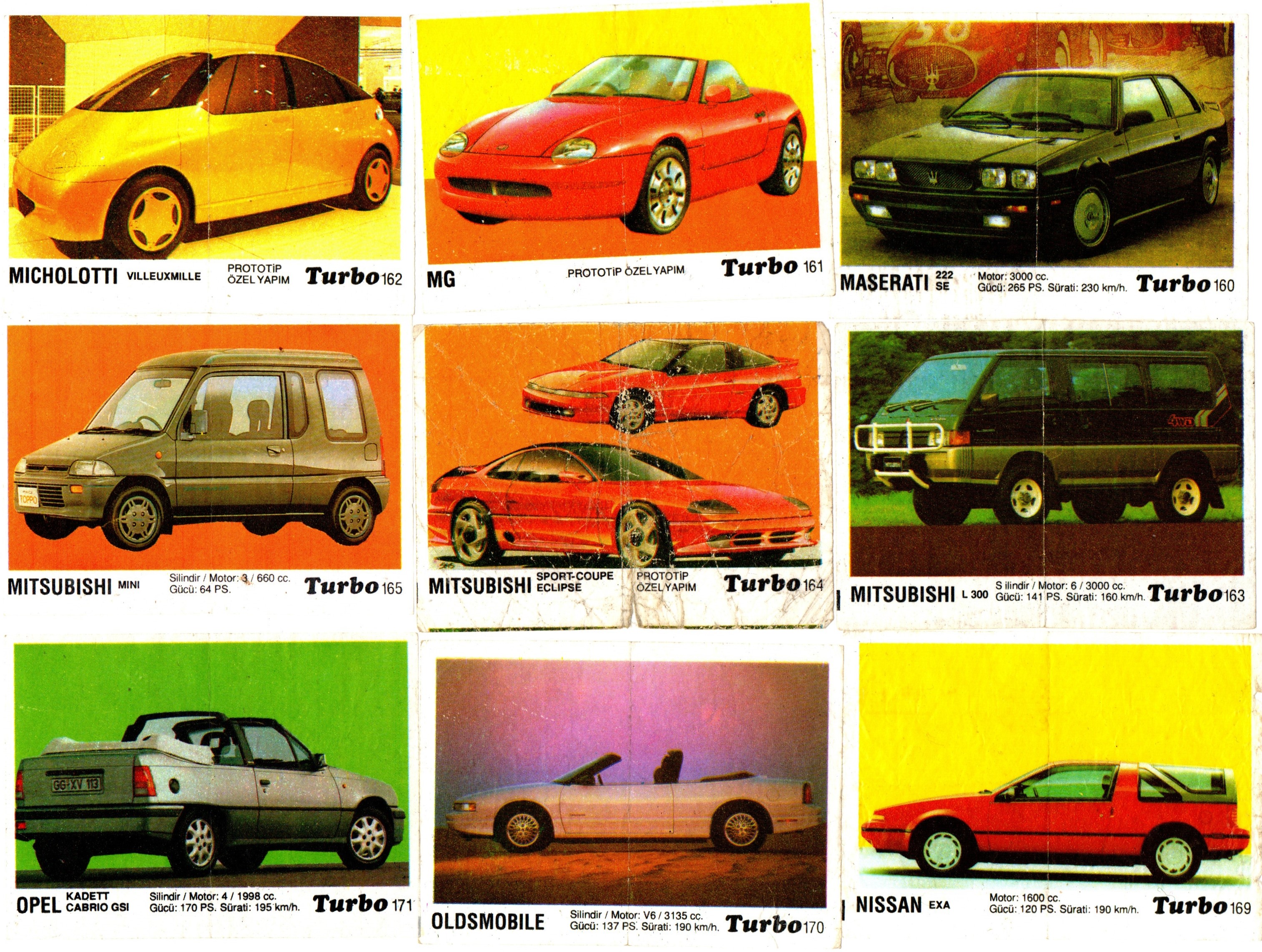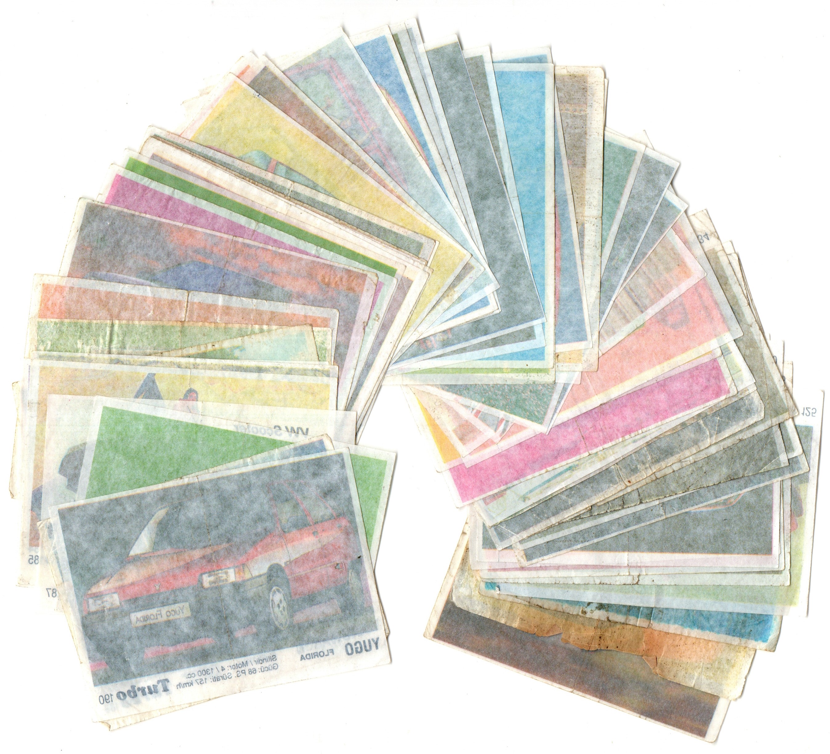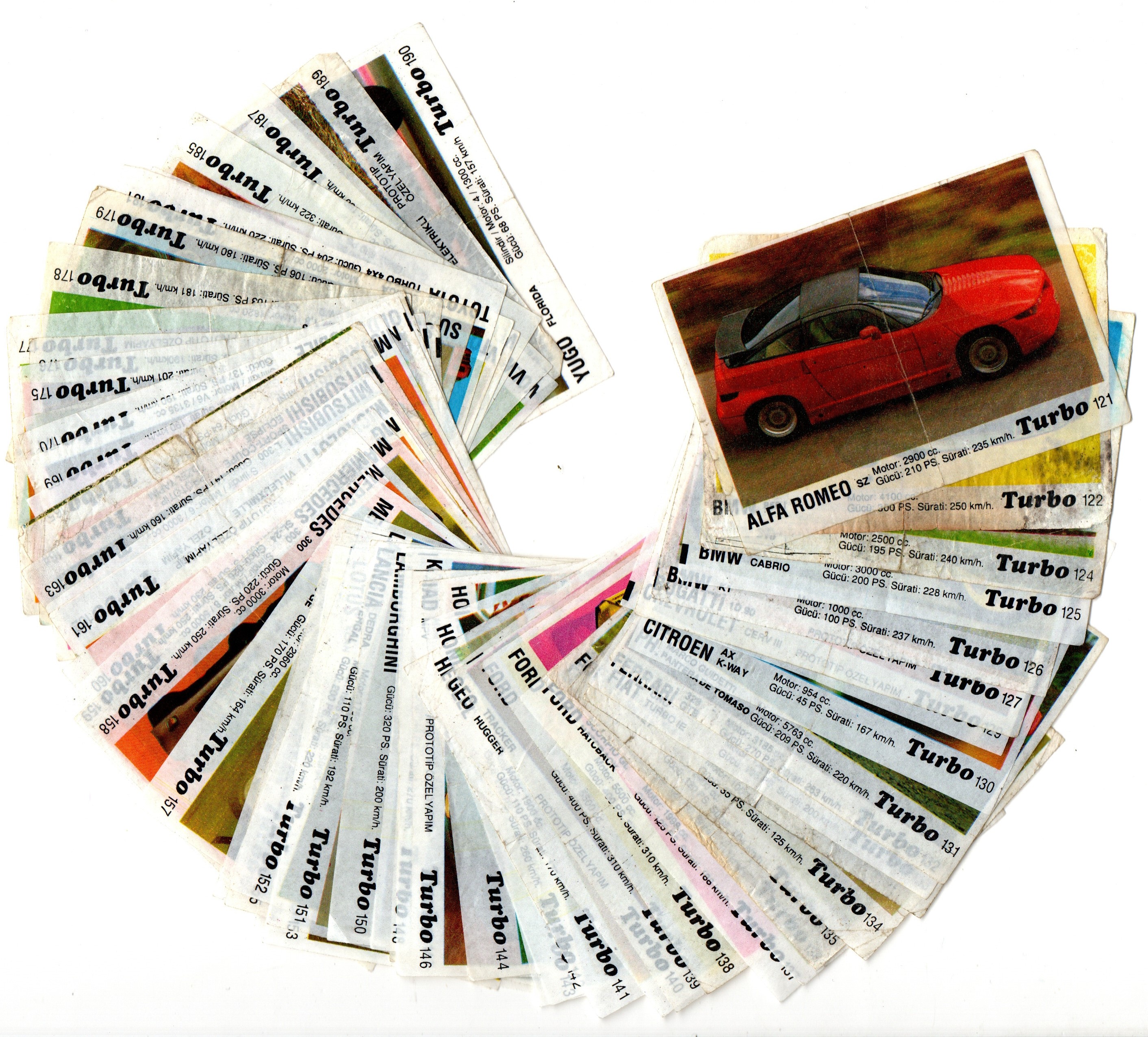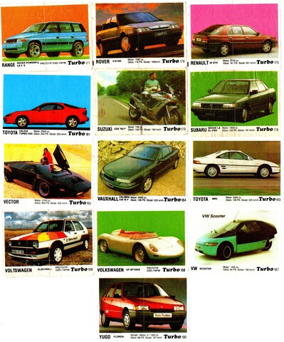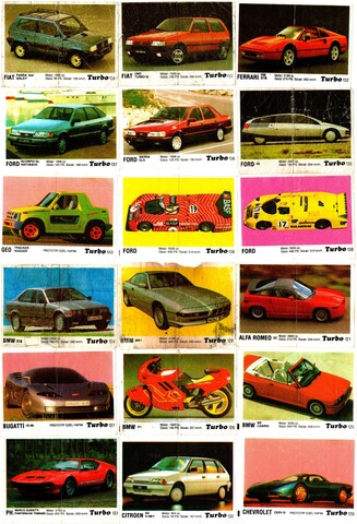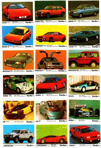 Коллекция вкладышей от жвачки Turbo Black - Турбо черные 58 штук без повторов. Серия 121 - 190. Черный логотип. Kent. Номера 121, 122, 124-127, 129-144, 146-149, 150-165, 169-171, 175-179, 181, 183-185, 187-190.