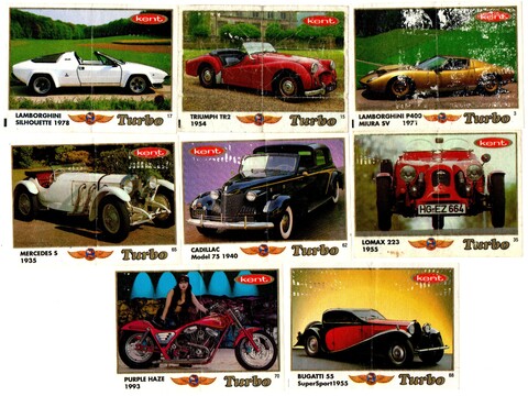 Коллекция вкладышей от жвачки Turbo Classic - Турбо Классик без надписи Classic. 8 штук без повторов. Серия 1 - 70. Золотистый логотип. Kent. Номера 3, 15, 17, 35, 62, 65, 68, 70