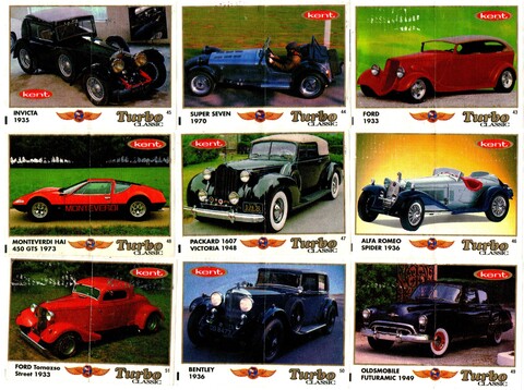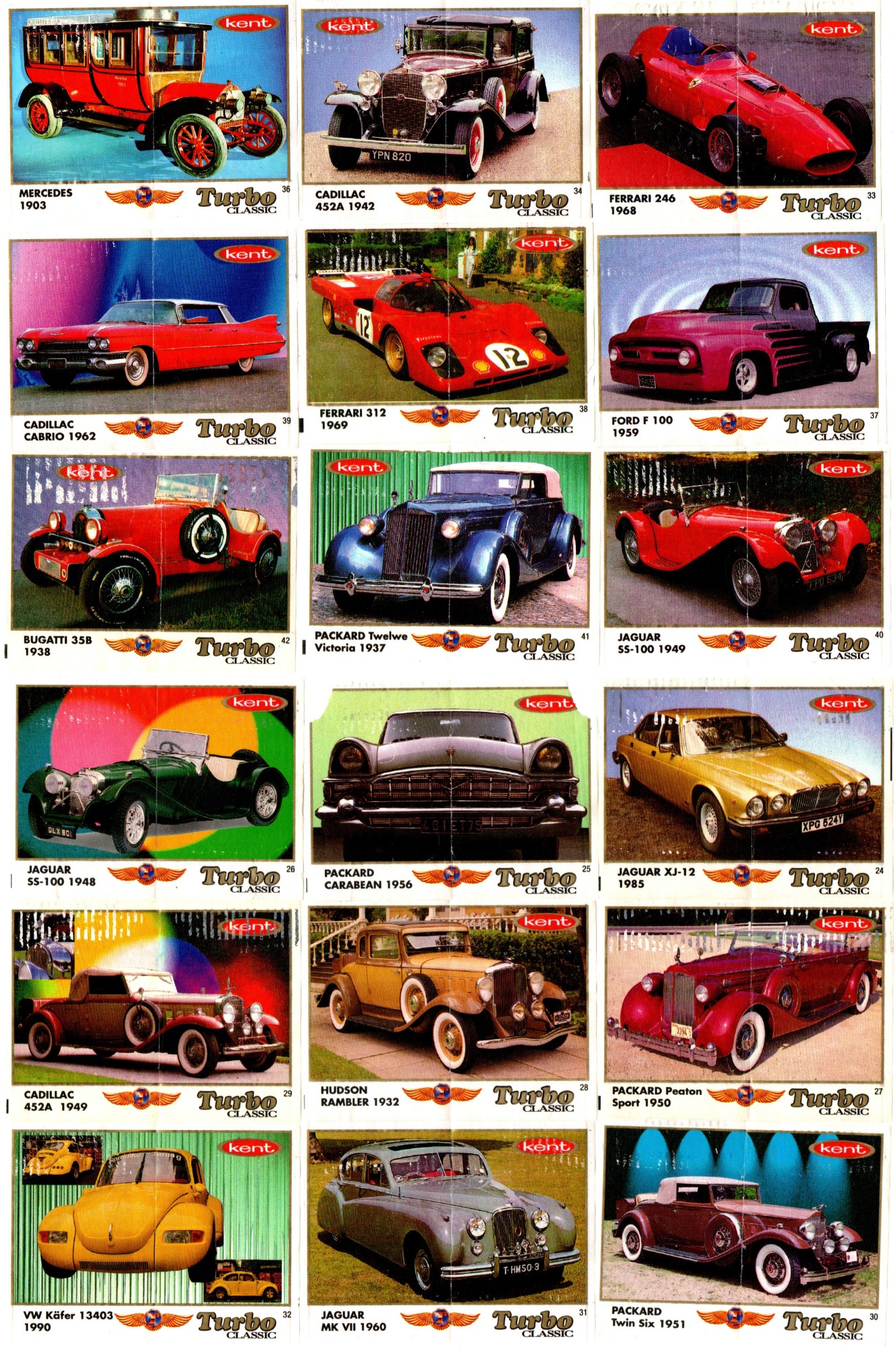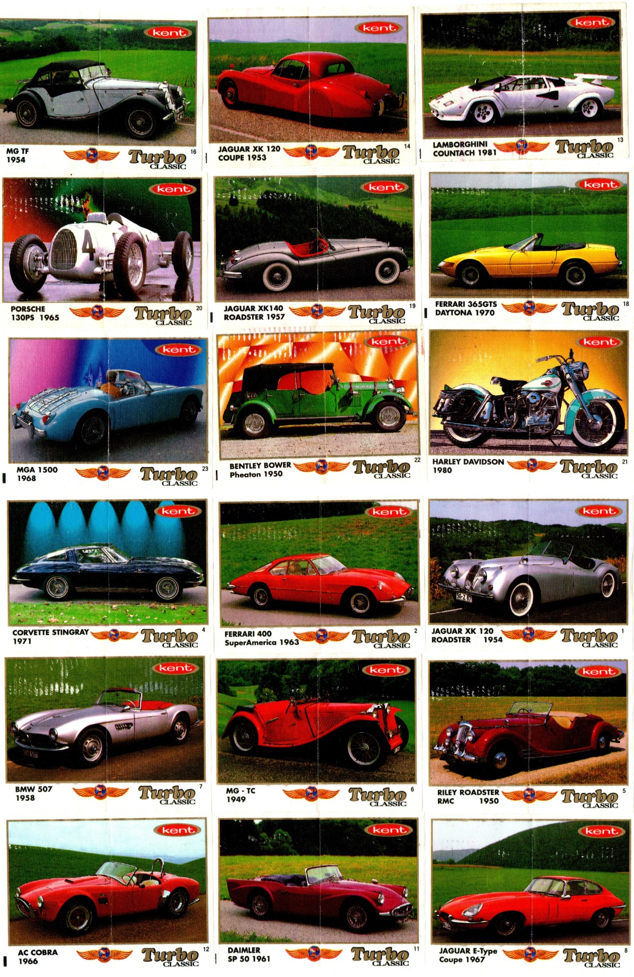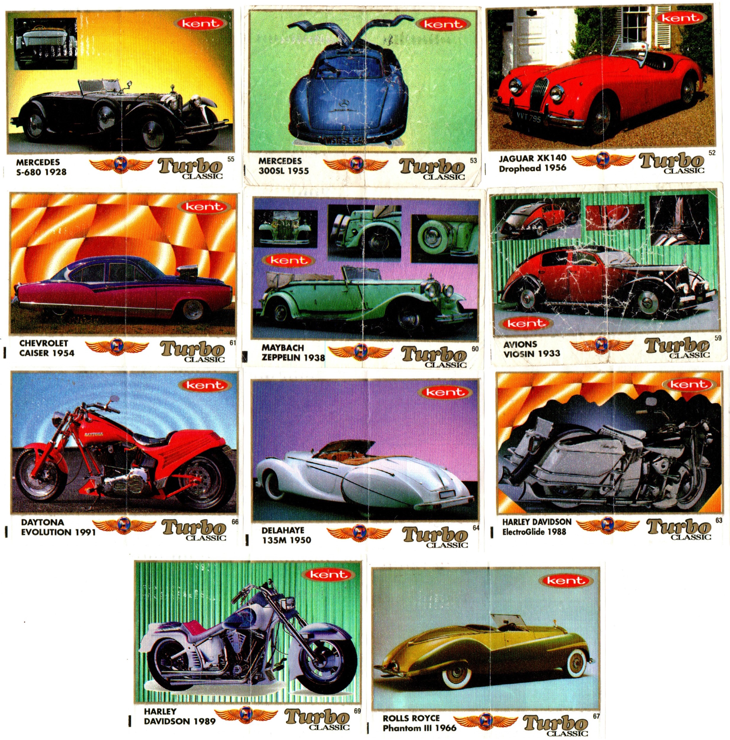 Коллекция вкладышей от жвачки Turbo Classic - Турбо Классик с надписью Classic. 56 штук без повторов. Серия 1 - 70. Золотистый логотип. Kent. Номера 1,2, 4-8, 11-14, 16, 18-34, 36-53, 55, 59-61, 63, 64, 66, 67, 69