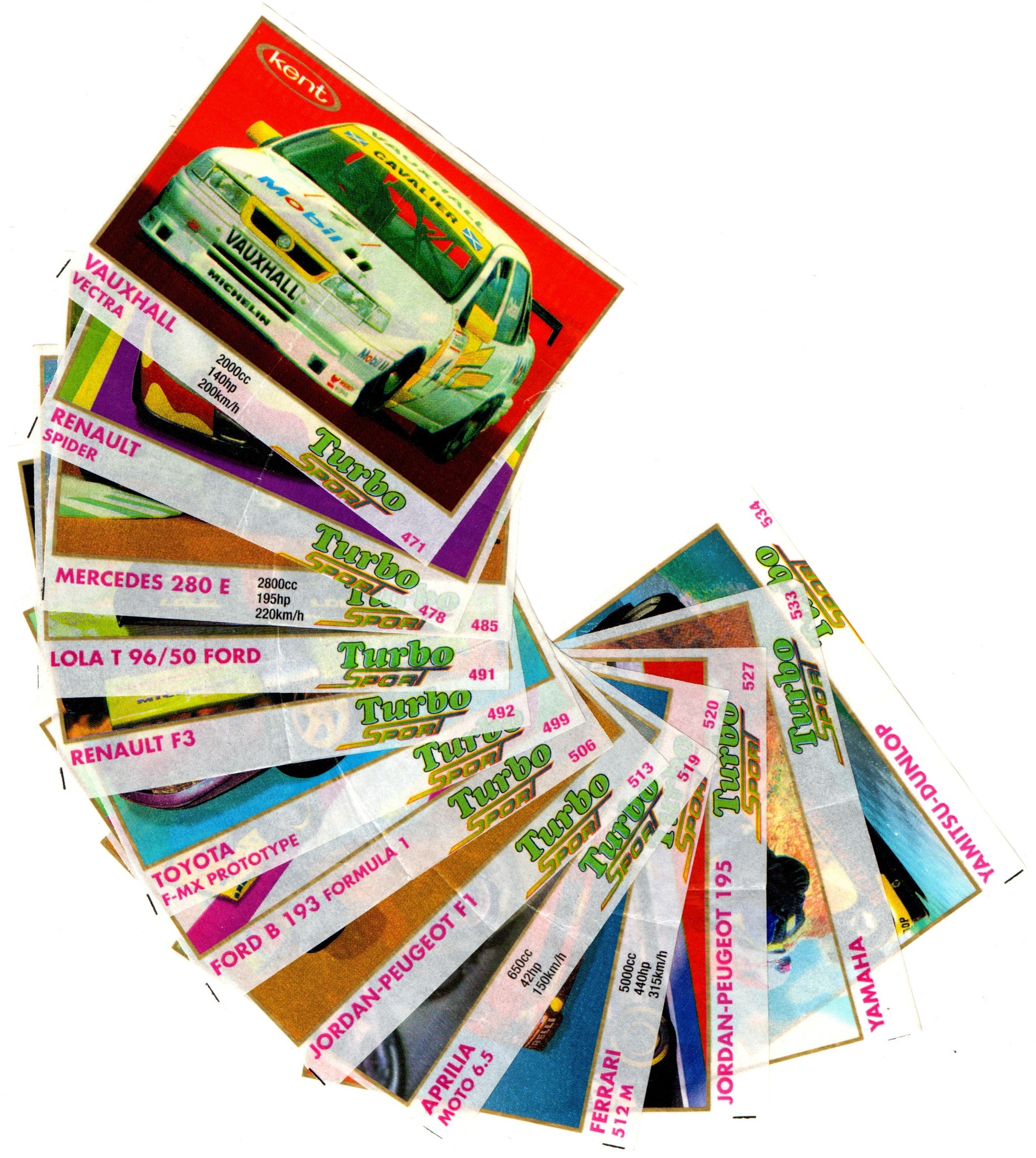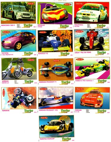 Коллекция вкладышей от жвачки Turbo Sport - Турбо Спорт 13 штук без повторов. Серия 471 - 540. Зеленый логотип. Kent. Номера 471, 478, 485, 491, 492, 499, 506, 513, 519, 520, 527, 533, 534.