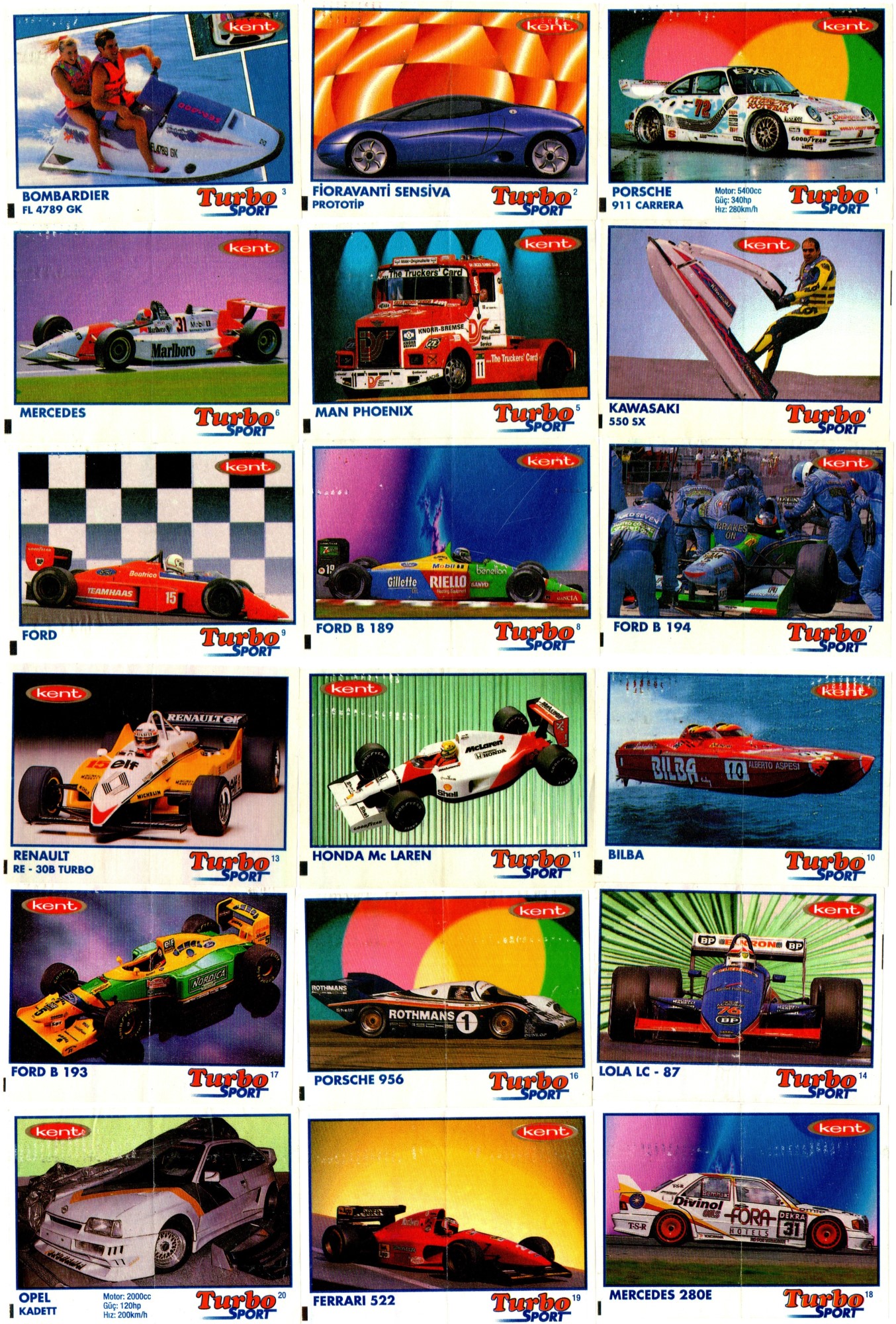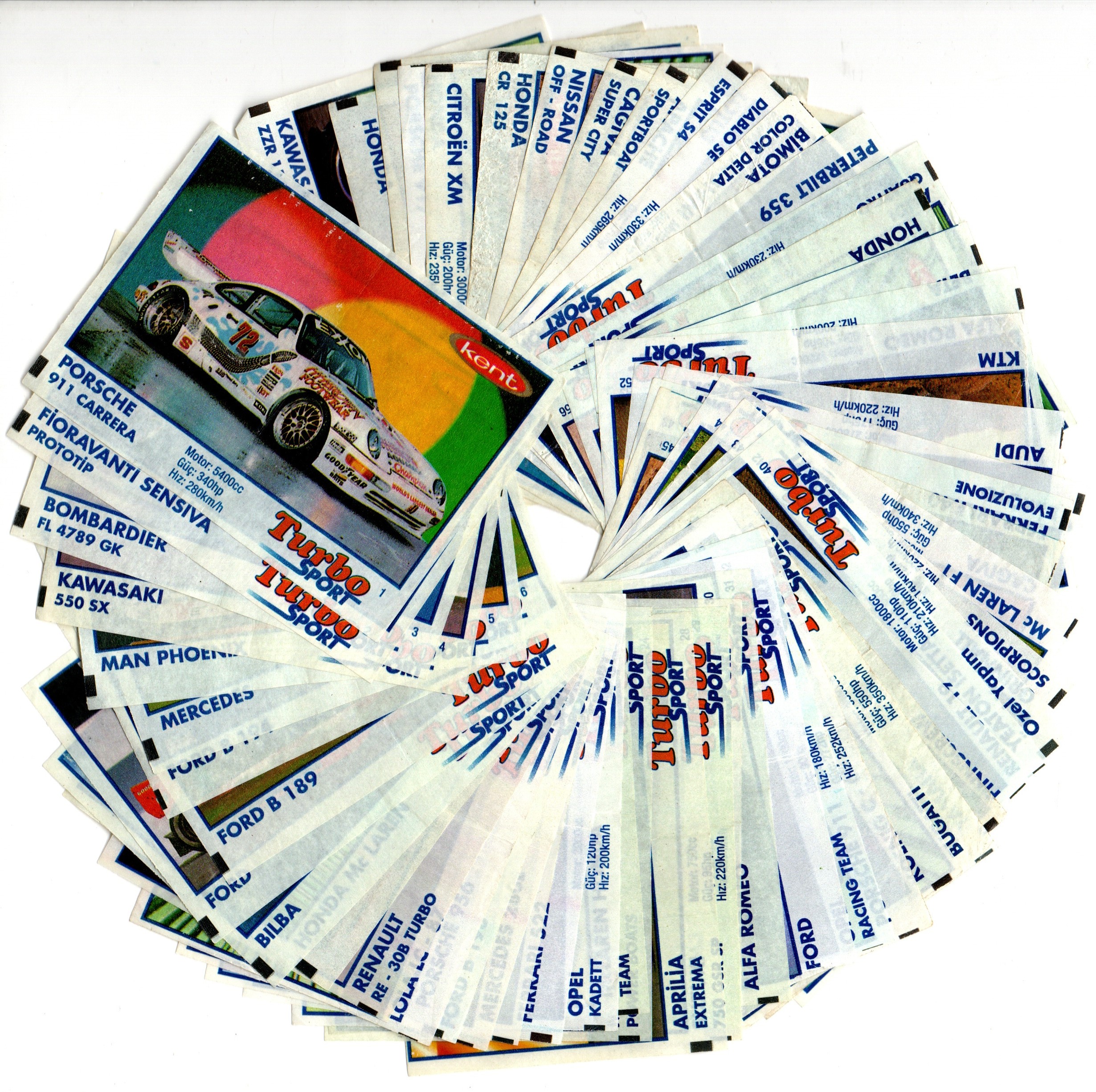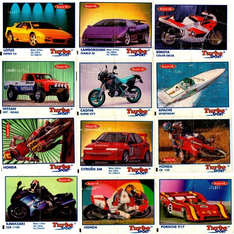 Коллекция вкладышей от жвачки Turbo Sport - Турбо Спорт 57 штук без повторов. Серия 1 - 70. Синяя рамка. Kent. Номера 1-11, 13-14, 16-21, 23,24, 28-37, 39,40, 42-45, 48, 50-54, 56-70