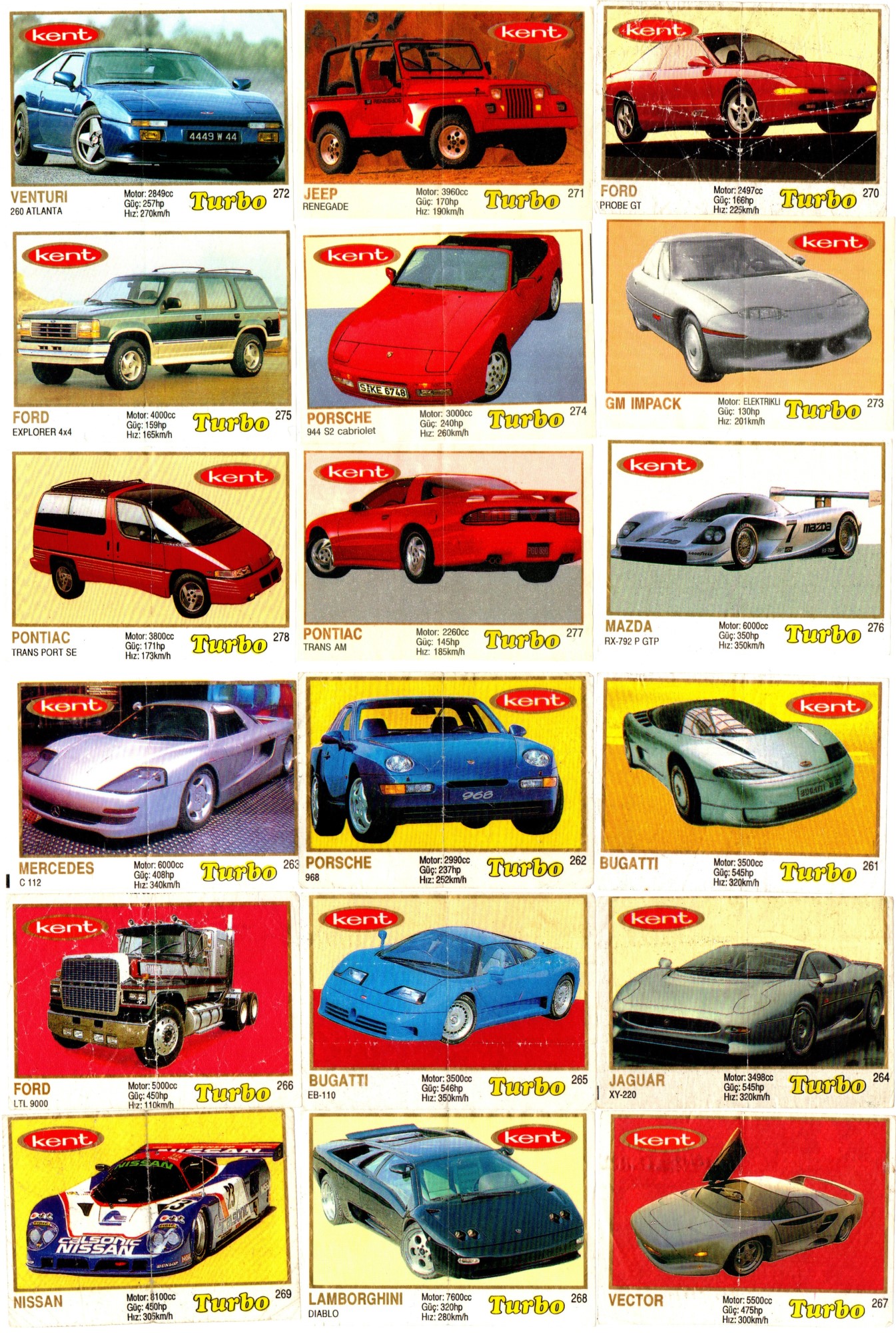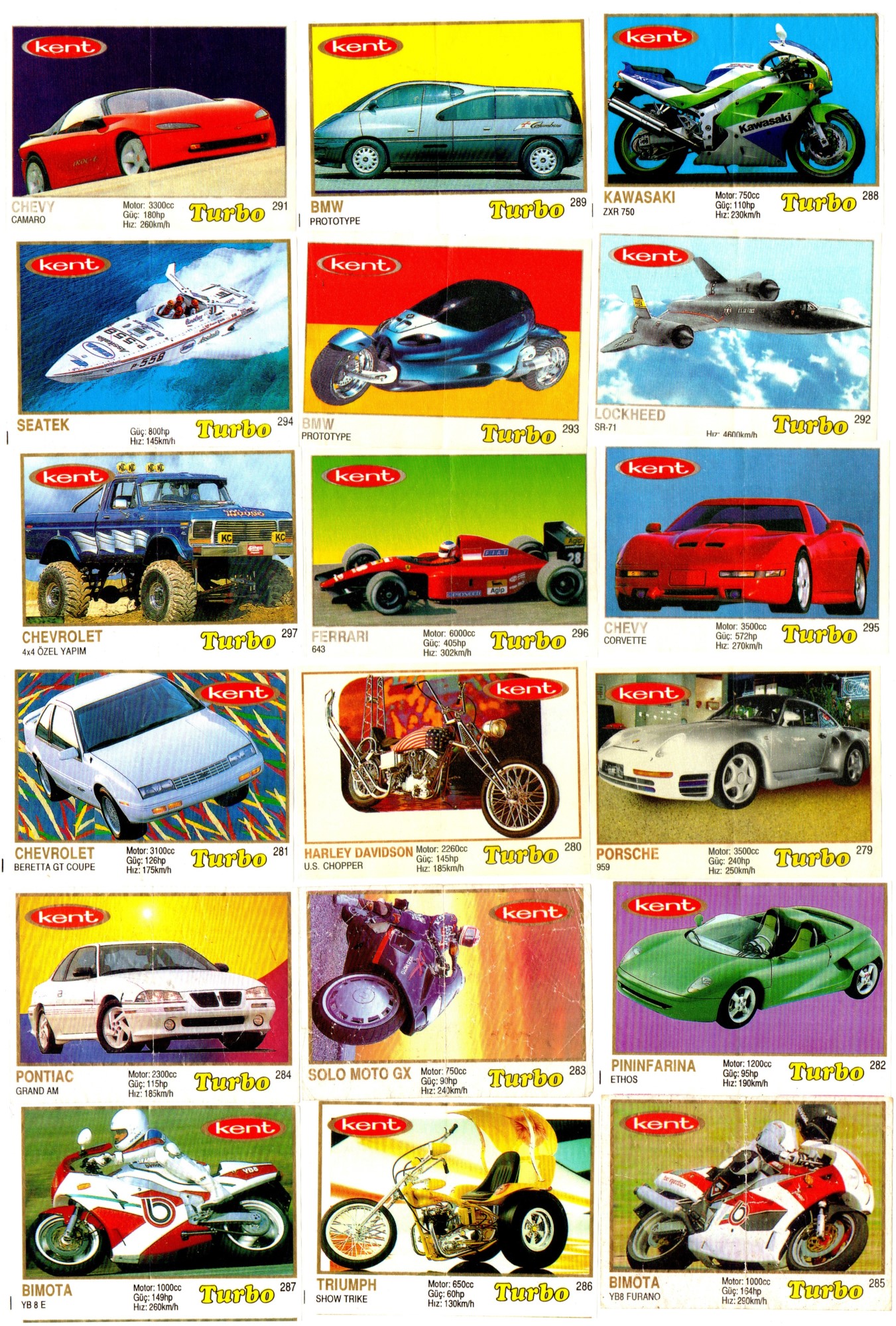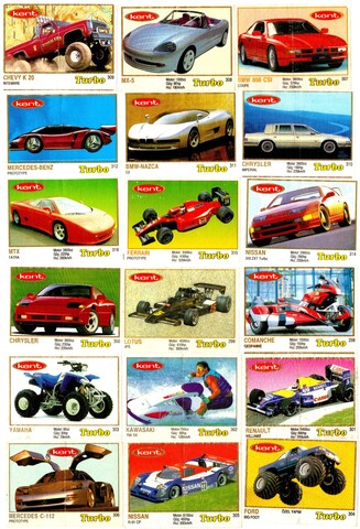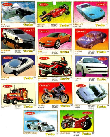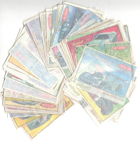 Коллекция вкладышей от жвачки Turbo Yellow - Турбо 63 штуки без повторов. Серия 261 - 330. Желтый логотип. Kent. Номера 261-289, 291-312, 314-322, 324-330
