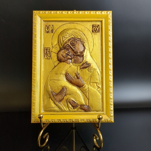 Владимирская икона Божией Матери. Старинная деревянная резная икона 27,5х12,5х2 см. Резьба по дереву выполнена вручную в 1980-е гг. СССР. Ручная работа. Автор данной работы Салангин Николай Васильвич - художник - иконописец Вятского края, мастер своего дела. Его работы так же находятся в некоторых храмах. Доска березы подобрана таким образом, чтобы кольца располагались в разные стороны, чтобы доска не изгибалась со временем. Резная икона из дерева изготовленна по православным канонам. Владимирская икона Божьей Матери исцеляет от болезней, помогает справиться с трудностями в жизни, покровительствует матерям и детям. Так же, Пресвятая Владимирская Богородица исцеляет от бесплодия и заболевания детородных органов. Дни празднования иконе Богоматери Владимирской : 3 июня, 23 июля и 8 сентября по новому стилю. Первообраз чудотворной иконы Богородицы попал на Русь из Византии в начале 12-го века: это был дорогой подарок русскому князю Мстиславу от самого Константинопольского патриарха Луки Хрисоверга. Сын Юрия Долгорукого, князь Андрей Боголюбский переместил древнюю намоленную икону из Вышгорода во Владимир, отчего Богородичный образ и получил нынешнее название. Во Владимире ценная икона хранилась в Успенском соборе, а ныне святой чудотворный образ Владимирской Божией Матери находится в Москве, в Третьяковской галерее.
