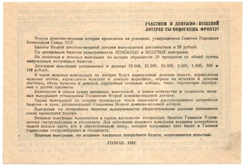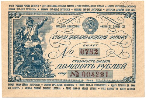 Вторая денежно-вещевая лотерея 20 рублей 1942 г. Номер 0782. Ранняя серия 004291