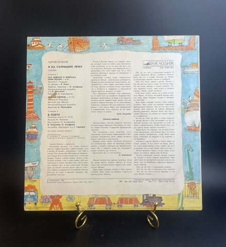 Я на солнышке лежу - Сергей Козлов. Детская сказка. Виниловая пластинка 12 дюймов. Мелодия СССР 1989 год. Гладков, Подгайц, Минков. Плятт, Анофриев, Толкунова, Гаранян. Сторона 1: Как Львенок и Черепаха пели песню. Музыка Г. Гладкова [Геннадий Гладков]. От автора — Р. Плятт [Ростислав Плятт], Львенок, Черепаха — О. Анофриев [Олег Анофриев]. Инструментальный ансамбль п/у Б. Демченко [Борис Демченко]. Режиссер И. Ковалевская [Инесса Ковалевская] / Лунная свирель. Музыка Е. Подгайца [Ефрем Подгайц]. Детский хор "Весна". Инструментальный ансамбль. Дирижер А. Пономарев [Александр Сергеевич Пономарёв] // Сторона 2: В порту. Песенная сюита. Музыка М. Минкова [Марк Минков]. При участии О. Анофриева. В. Толкунова [Валентина Толкунова], О. Анофриев. Ансамбль "Мелодия" п/у Г. Гараняна [Георгий Гаранян]. Для детей младшего возраста. Звукорежиссеры: В. Антоненко [Василий Антоненко], Р. Рагимов [Рафик Рагимов], П. Кондрашин [Петр Кондрашин]. Редактор И. Якушенко [Ирина Якушенко]. Художник Л. Шульгина. Текст на обложке — Булат Окуджава, П. Меркурьев. Присутствуют следы использования, царапинки. Состояние на фото