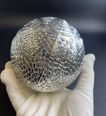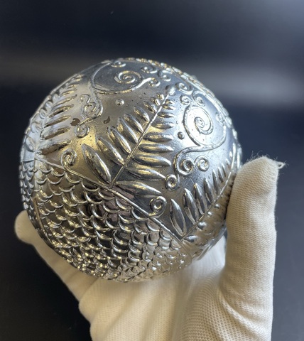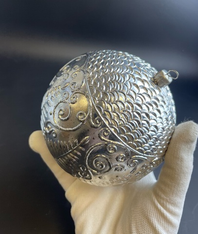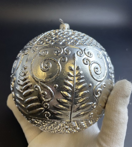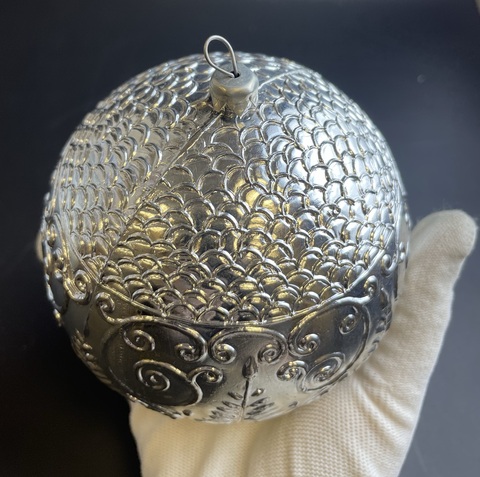 Ёлочная игрушка Кремлевский шар с рельефным узором пластик, серебристый цвет, окружность -34 см, винтаж СССР 1960-1990 гг