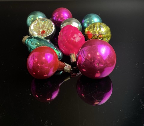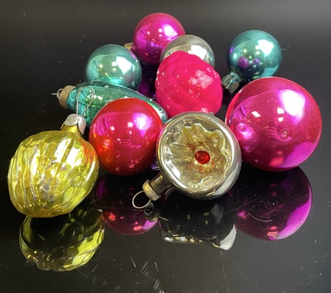 Ёлочные игрушки набор из 10 маленьких штук разных, шарики, малинка, огурец, стекло, подвесные, винтаж СССР 1960-1980 гг