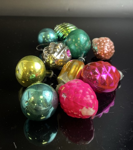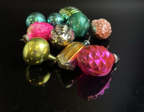 Ёлочные игрушки набор из 10 маленьких штук разных, шарики, малинка, тюльпан, стекло, подвесные, винтаж СССР 1960-1980 гг