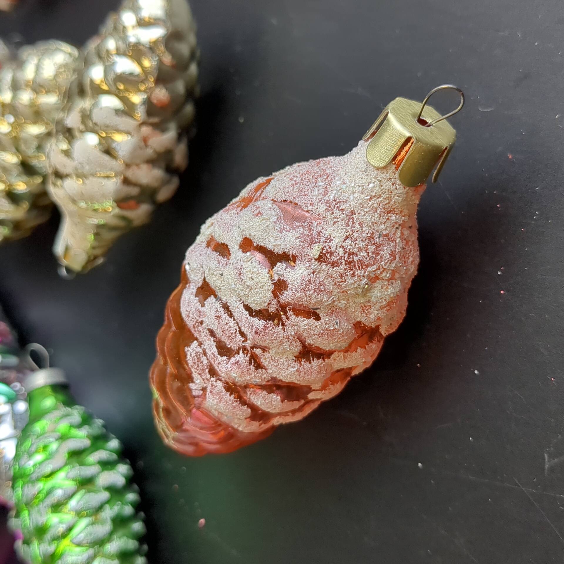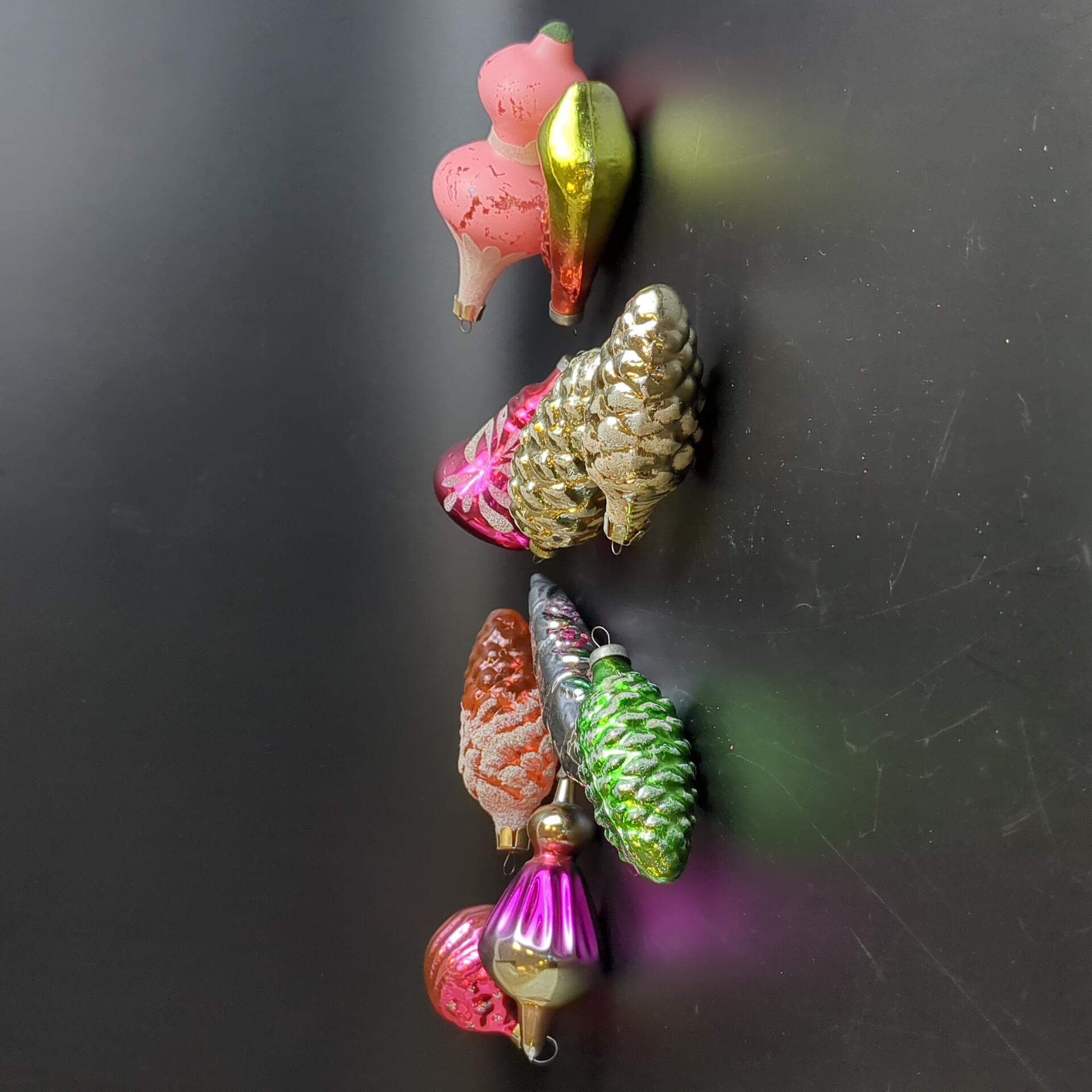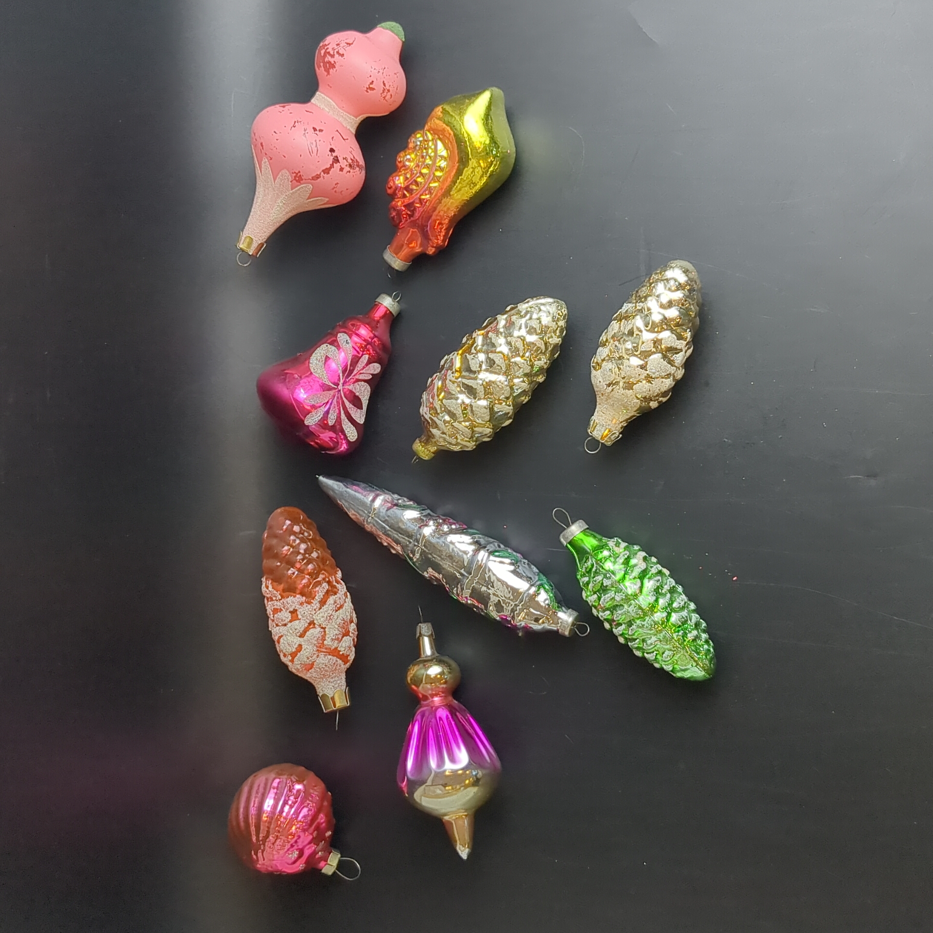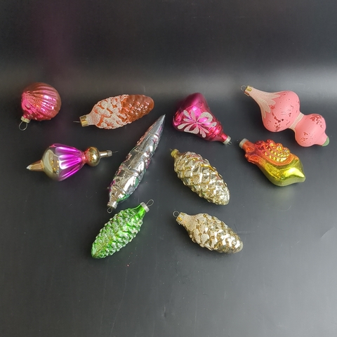 Ёлочные игрушки набор из 10 разных шишки, сосульки, колокольчик и др, стекло, роспись, узоры, подвесные, винтаж СССР 1960-1990 гг